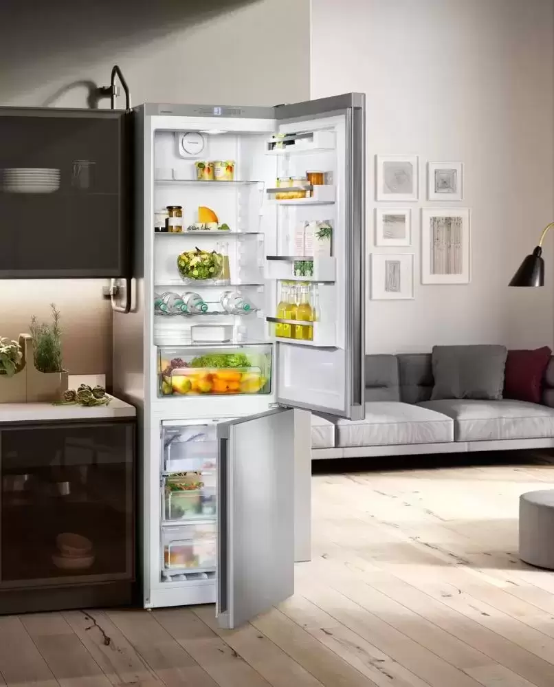 Модель высотой 186 см может устанавливаться вплотную к стене или в готовую нишу. Корпус серебристого цвета целиком выполнен из стали, а покрытие SmartSteel защищает его от отпечатков пальцев. Выровнять прибор при установке помогут регулируемые ножки. В холодильной камере расположены полки из ударопрочного стекла, которые можно легко переставить по высоте, большой ящик для фруктов и овощей и металлическая полка для бутылок. На дверце имеются 3 полки и отделение для хранения консервов. В морозильном отделении объемом 95 литров находятся плотно закрывающиеся ящики FrostSafe, сохраняющие холод при частом открывании дверцы. Если предстоит разместить большое количество свежих продуктов, можно воспользоваться режимом SuperFrost, быстро понижающим температуру. Время хранения продуктов при отключении электроэнергии составляет 26 часов, а производительность замораживания достигает 10 кг в сутки . Система полок и контейнеров VarioSpace предусматривает их легкое извлечение для размещения в морозильнике больших продуктов.