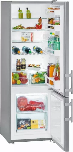 Холодильник Liebherr CUef 2811 Comfort выполнен из стали в серебристом цвете. Устройство хорошо сочетается с другой бытовой техникой, а так гармонично вписывается в различные стилевые решения. Модель представляет собой классическую комбинацию из холодильного и морозильного отделений. Сверху — разнообразие регулируемых по высоте полочек, ящиков, а также держателей — все для комфортного расположения продуктов, упаковок и бутылок. Снизу — два пластиковых прозрачных ящика, в которые легко убирается даже что-то габаритное. Они легко выдвигаются и хорошо просматриваются. Светодиодная подсветка хорошо освещает камеру на любом из уровней. Холодильник Либхер CUef 2811 сохраняет холод в течение 25 часов после отключения электроэнергии. Прибор работает тихо и не мешает пользователям — уровень шума не превышает 39 дБ.