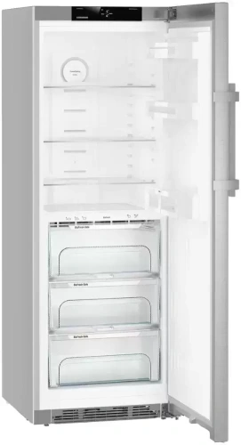 Отдельно стоящая модель без морозильника высотой 165 см и объемом 359 литров изготовлена в Германии. Она относится к самой новой серии BluPerformance, предусматривающей дополнительную установку модуля SmartDeviceBox для дистанционного управления настройками с мобильных устройств. Модель в серебристом корпусе из стали с покрытием SmartSteel против отпечатков пальцев имеет алюминиевую ручку со встроенным механизмом открывания. За дверцей располагается 2,4-дюймовый сенсорный монохромный TFT-дисплей, позволяющий регулировать температуру в камере в диапазоне от +2°C до +9°C.