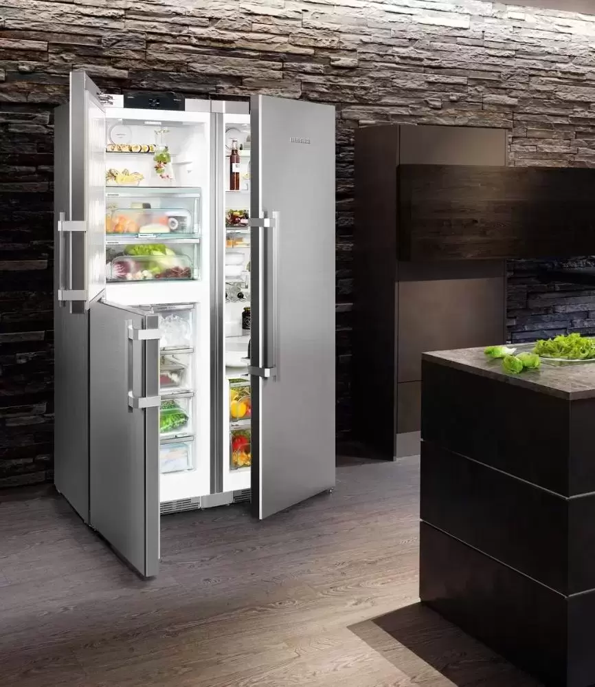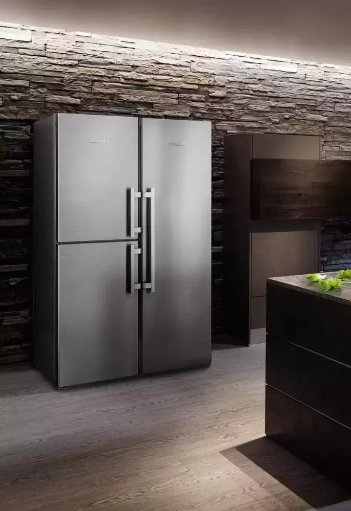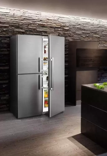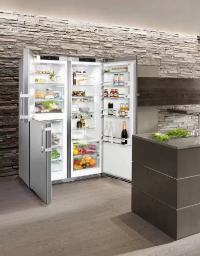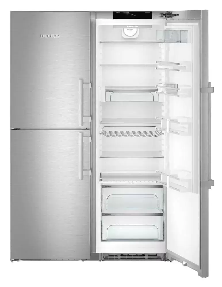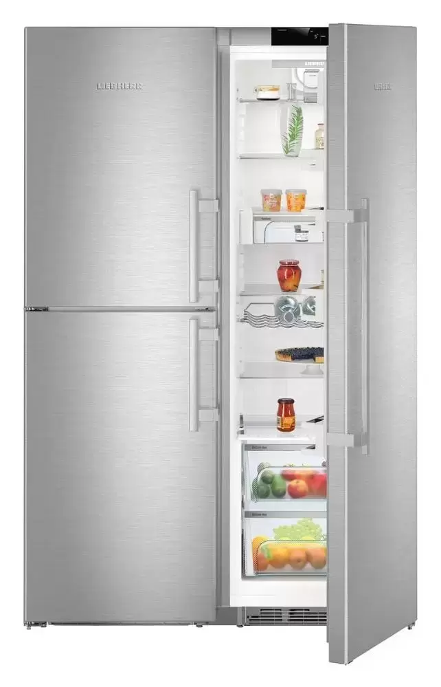 Liebherr SBSes 8483 — холодильник Side-by-side объемом 688 л. Отдельно стоящая модель шириной 121 см предназначается для просторных помещений. Фасад из нержавеющей стали и боковые стороны из легированной стали имеют защиту от отпечатков пальцев SmartSteel. Двери оборудованы встроенным механизмом открывания и доводчиком. Модель допускает установку вплотную к стене.