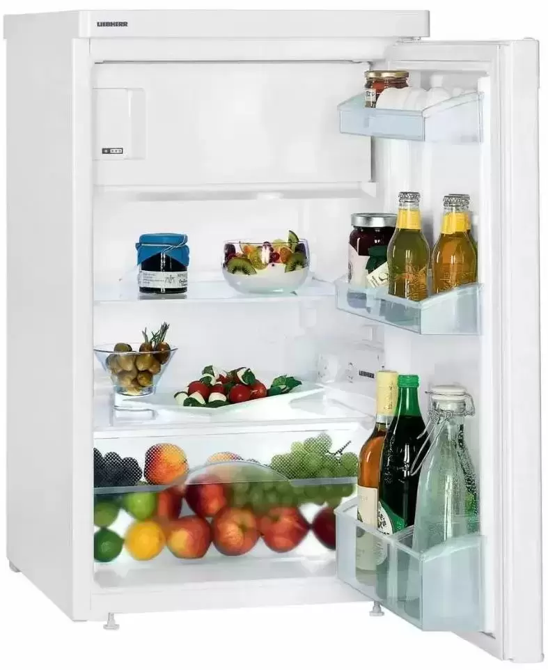 Холодильник Liebherr T 1504 — компактная отдельно стоящая модель высотой 85 см и общим объемом 118 литров для небольшой квартиры, офиса, отеля. Корпус белого цвета с глянцевым фасадом украшает стильная ручка. Благодаря фронтальной вентиляции холодильник можно установить вплотную к стене. Небольшая морозильная камера расположена сверху. Правый упор двери можно поменять при выборе места для размещения прибора. В холодильной камере для размещения продуктов предусмотрены две полки из закаленного стекла, верхнюю полку можно перенести по высоте или извлечь для загрузки продуктов большого размера. на двух полках, изготовленных из ударопрочного стекла, одна из полок может регулироваться по высоте. Для хранения овощей и фруктов служит большой прозрачный контейнер. Капельная система размораживания предотвращает появление наледи на стенках и упрощает оттаивание. Для регулировки температуры предназначается поворотный переключатель. Устройство оснащено системой Cool Plus, предохраняющей устройство от размораживания при низких наружных температурах.