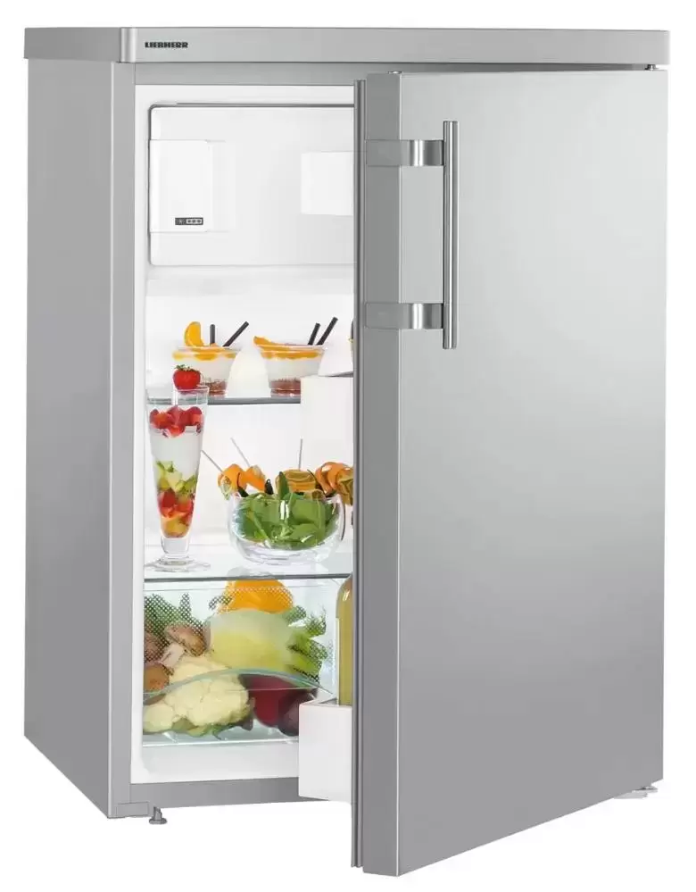 Холодильник Liebherr TPesf 1714 Comfort — компактный прибор высотой 85 см из дизайн-серии HardLine. Модель отличает серебристый стальной корпус, дверца из нержавейки и удобная ручка со встроенным толкателем. Благодаря стандартной ширине 60 см и съемной верхней панели устройство можно установить под столешницей или разместить в готовой нише. При автономном размещении верхняя панель послужит в качестве стола. Облегчить выбор места для установки прибора помогут перенавешиваемая дверца и регулируемые по высоте ножки. Общий объем холодильника составляет 152 литра. Расположенная сверху 4-звездочная морозильная камера объемом 19 литров позволяет поддерживать температуру −18°C и ниже. Она способна сохранять холод на протяжении 10 часов при отключении электроэнергии. В холодильном отделении одну из двух полок из ударопрочного стекла можно переставить по высоте. Бутылки и банки могут устанавливаться на съемных полках, расположенных на дверце. Климатический класс SN-ST позволяет использовать прибор при наружной температуре от +10°С до +38°С.