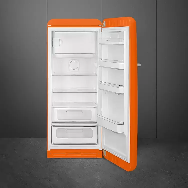 Холодильник Smeg FAB28ROR5 выполнен в ярком оранжевом цвете. Модель в таком оформлении сможет стать главным украшением вашего кухонного гарнитура. Выпуклый корпус агрегата имеет закругленные углы, что делает прибор визуально более компактным и аккуратным. Стиль 50-х годов добавляет еще больше эстетики и индивидуальности. Предусмотрен акустический и визуальный сигналы на случай, если дверца осталась открытой. Внутреннее LED-освещение холодильной камеры не содержит вредных веществ, а также обладает устойчивостью к холодным температурам.