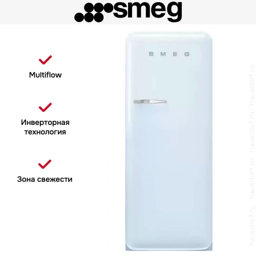 Холодильник Smeg FAB28RPB5 выполнен в пастельно-голубом цвете. Прибор имеет выпуклый корпус и закругленные углы, что делает его визуально более компактным. Большей эстетики придает дизайн в стиле 50-х годов. Агрегат оснащен вентилятором, который обеспечивает равномерное распределение холодного воздуха, что гарантирует одинаковую степень охлаждения продуктов питания. Антибактериальный уплотнитель предотвращает образование бактерий, микроорганизмов, а также плесени в холодильнике.