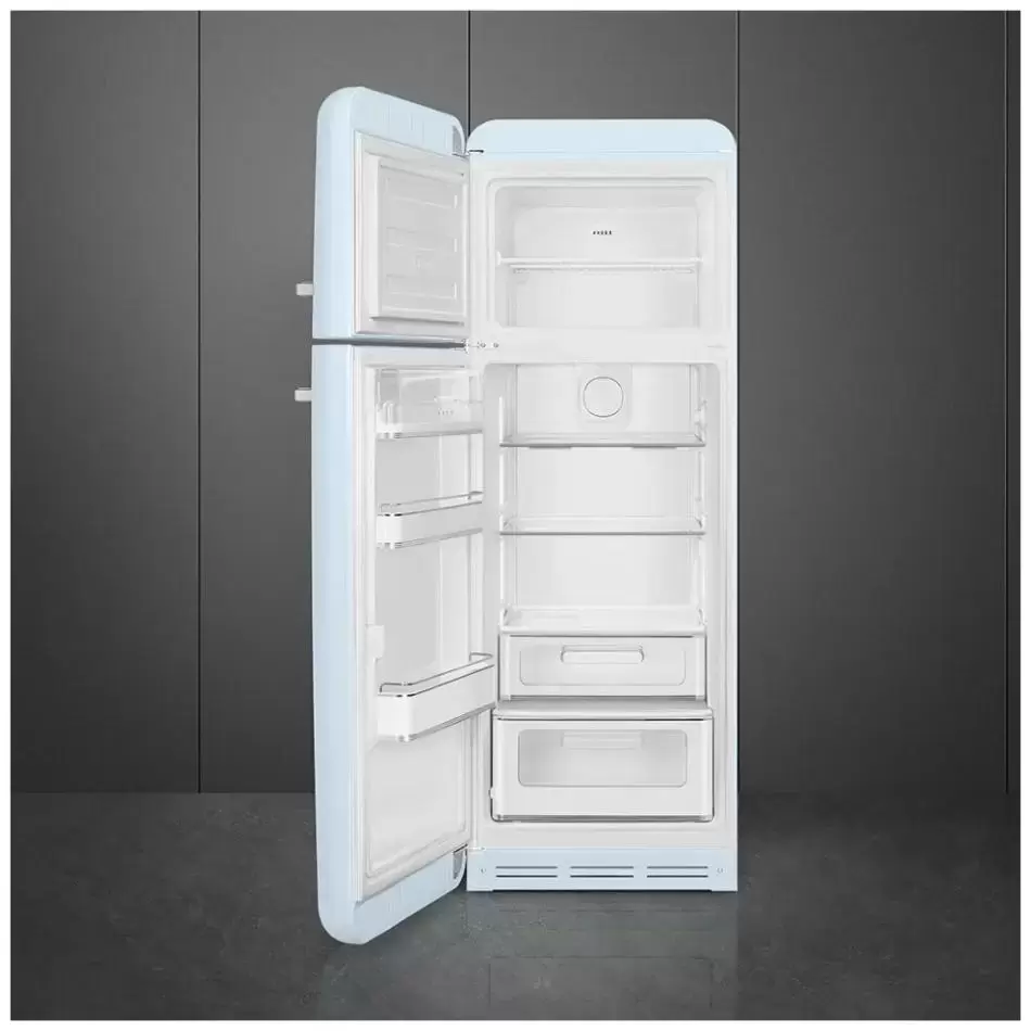 Отдельностоящий холодильник Smeg FAB30LPB5 выполнен в стиле 50-х годов и имеет класс энергопотребления A + + +, который позволяет сохранять высокую эффективность работы при 30% экономии электроэнергии. Принудительная вентиляция грамотно распределяет холодный воздух внутри прибора. LED-подсветка обеспечивает безопасное и яркое освещение. Система автоматического размораживания освобождает вас от самостоятельной разморозки модели. Специальный низкотемпературный отсек позволяет дольше хранить продукты. Холодильник высотой 172 см и объемом 298 литров отличается верхнее расположение морозильной камеры. Поддержание низкой температуры при отключении энергии возможно в течение 30 часов, а производительность замораживания составляет 4 кг в сутки. Полки из ударопрочного стекла регулируются по высоте.