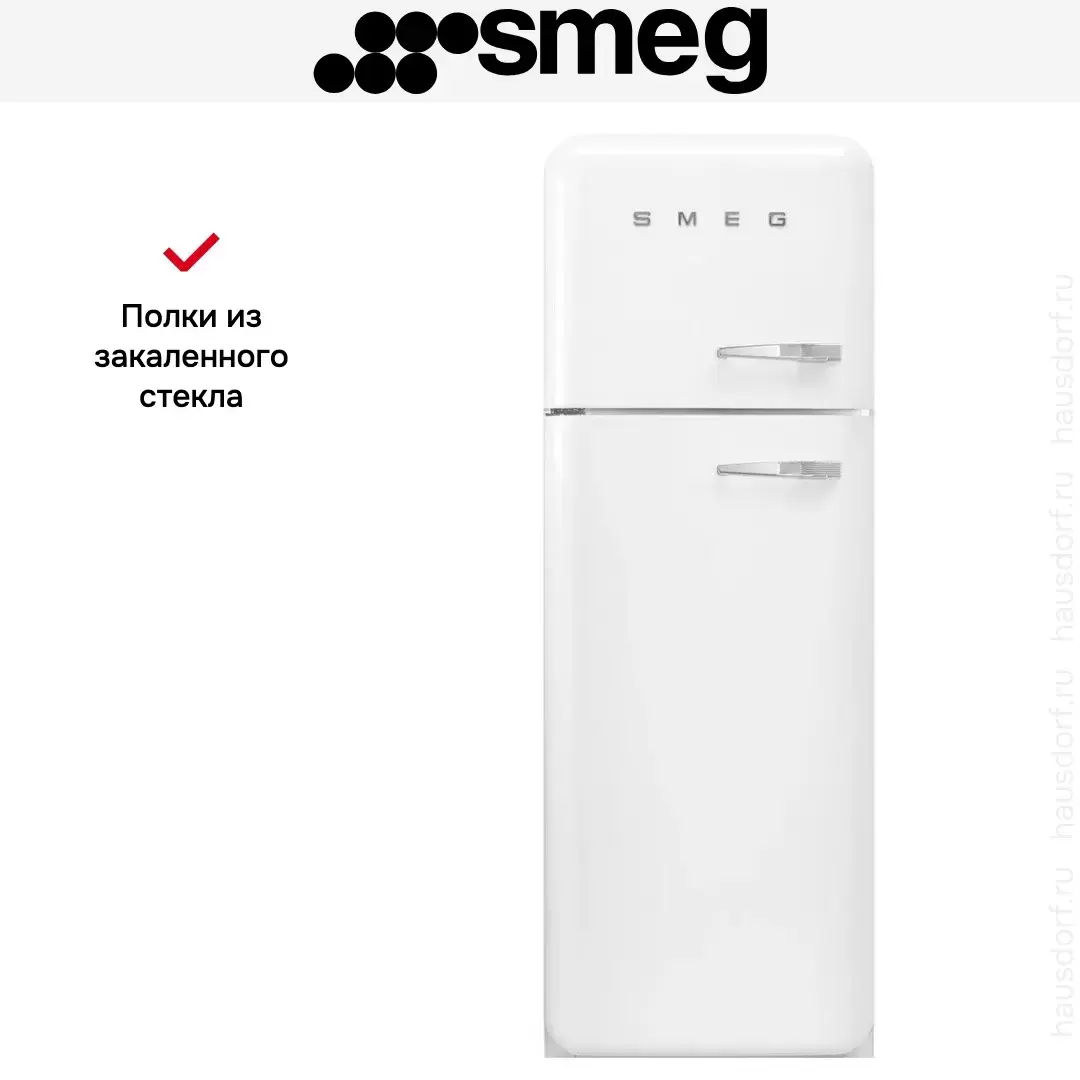 Smeg FAB30LWH5 — белый отдельно стоящий холодильник с дверным упором слева. Морозильная камера расположена сверху и способна сохранять холод при отключении электроэнергии на протяжении 30 часов. Полки в холодильной камере изготовлены из ударопрочного стекла и могут регулироваться по высоте.