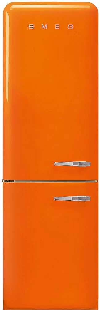 Smeg FAB32LOR5 — холодильник высотой 197 см объемом 365 литров и высотой 197 см. Корпус оранжевого цвета выполнен в стиле 50-х годов. Уход за устройством облегчает система размораживания No Frost. Быстро понизить температуру при загрузке большого количества продуктов поможет режим суперзаморозки.