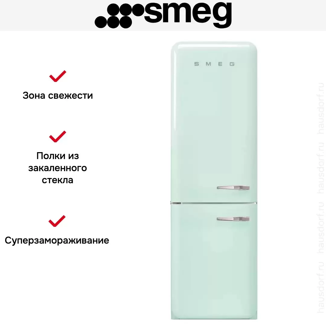 Smeg FAB32LPG5 — модель пастельно-зеленого оттенка с дверным упором слева и нижним расположением морозильной камеры. Оборудована зоной свежести для хранения свежих продуктов без замораживания. При загрузке новой порции продуктов в морозильник может использоваться режим суперзамораживания.