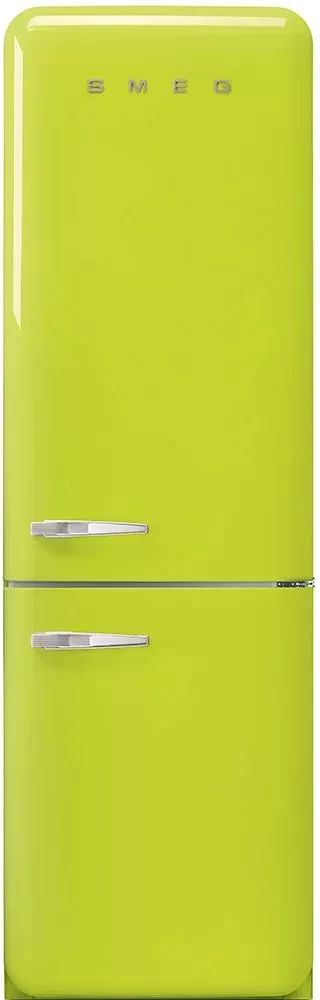 Smeg FAB32RLI5 — отдельно стоящий двухдверный холодильник с правой дверцей высотой 197 см и шириной 60 см для большой кухни. Его отличает оригинальный цвет лайма и дизайн в духе 50-х годов. Морозильная камера объемом 97 литров расположена снизу и содержит 3 больших ящика. Она оснащена системой размораживания No-Frost, поддерживает автономное сохранение холода в течение 40 часов. Для хранения мяса и рыбы служит зона свежести Life Plus 0°C. Полки из закаленного стекла регулируются по высоте.