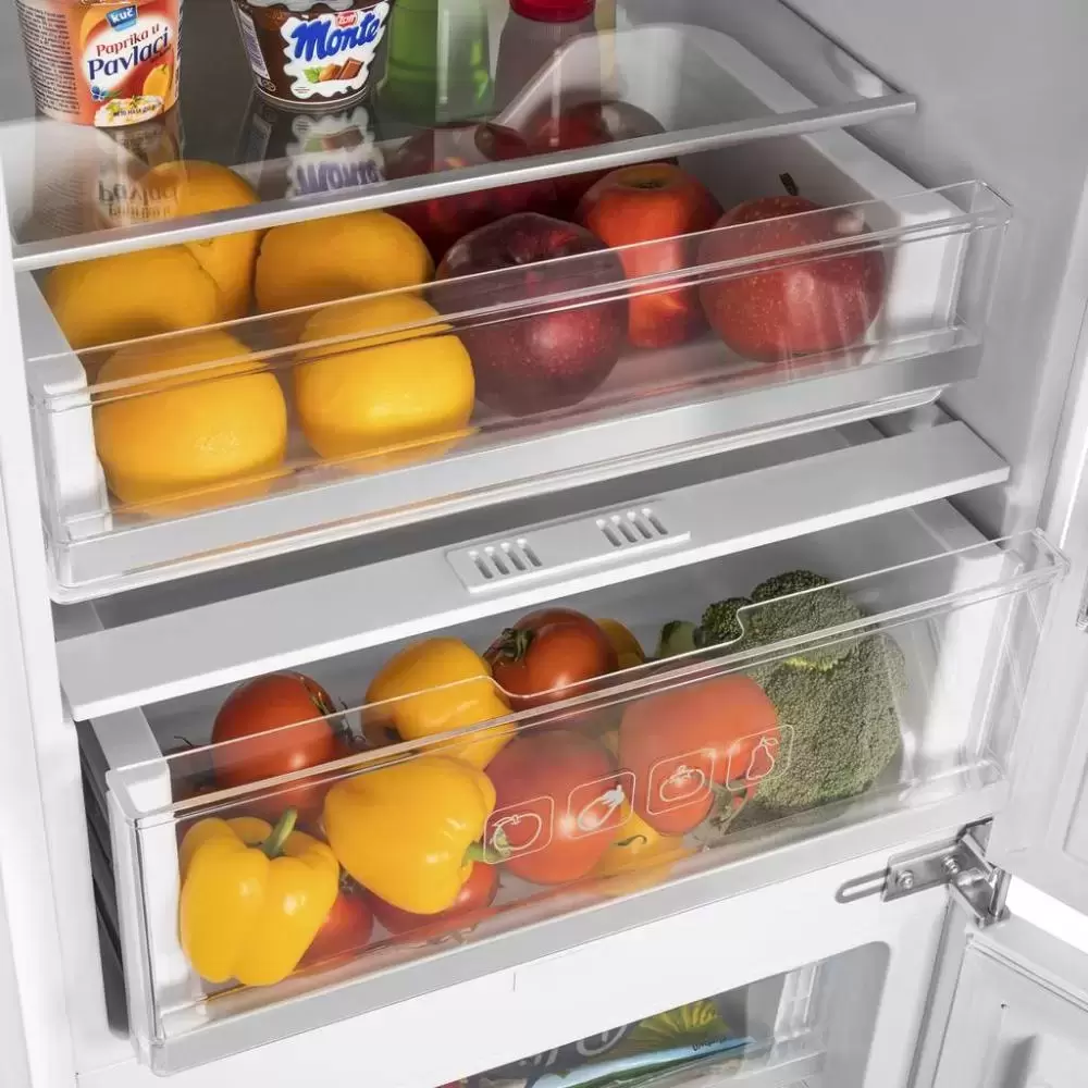 Внутреннее наполнение холодильной камеры — три полки из закаленного стекла с металлической окантовкой и регулировкой по высоте. В нижней части находится большой прозрачный ящик для фруктов и овощей, а над ним — зона свежести для хранения продуктов без замораживания. В морозильной камере для размещения продуктов служат три прозрачных пластиковых выдвижных ящика. Очистка холодильника не составит труда благодаря системе размораживания No Frost.