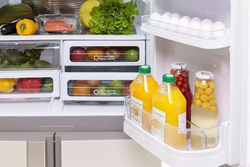 Помимо специальных ящиков для сохранения свежих продуктов есть стандартные контейнеры, в которые можно также положить овощи или другие продукты, не требующие специальных условий. В морозильной камере внизу расположены отделения разной высоты, которые вмещают достаточно заготовок и полуфабрикатов для всей семьи.