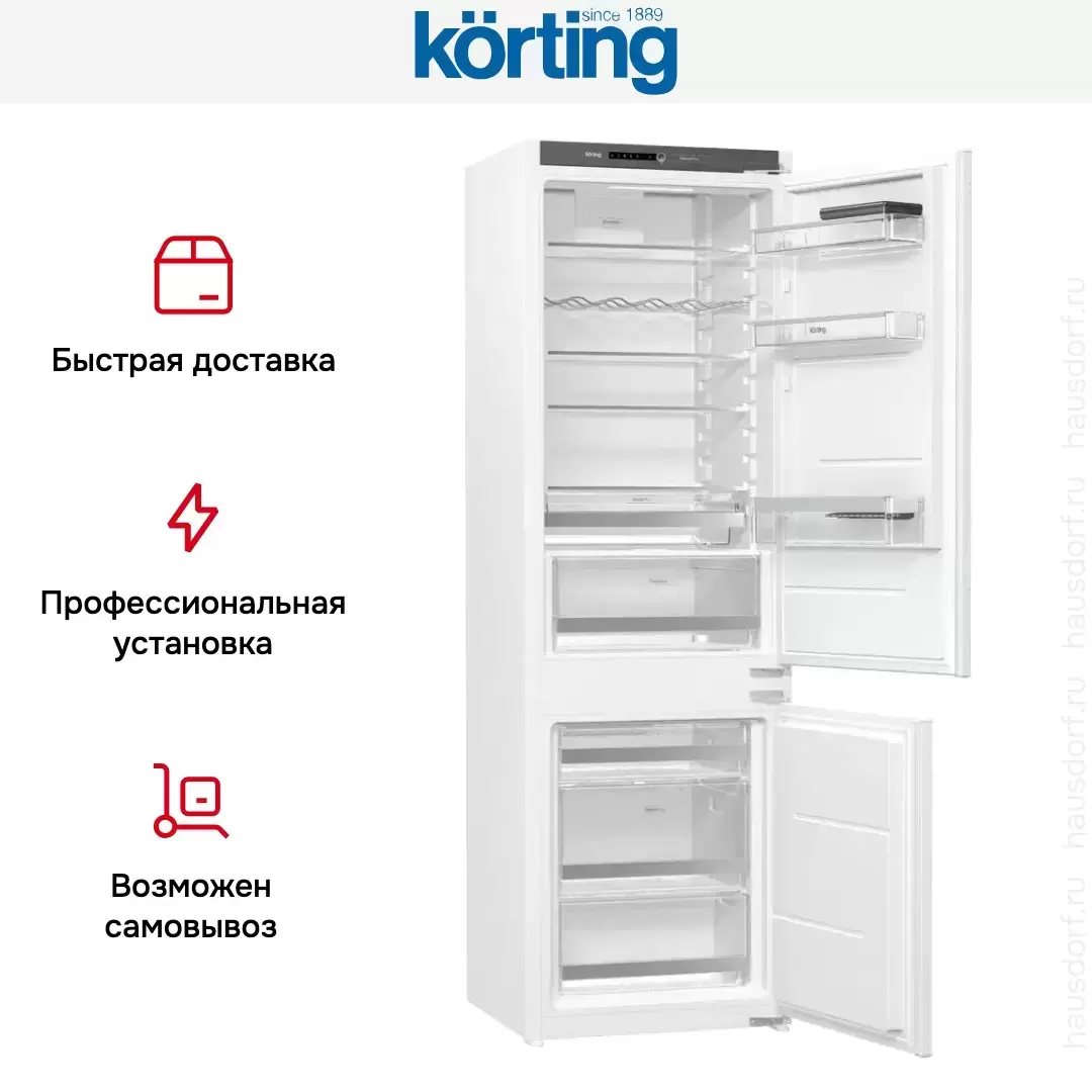 Korting KSI 17877 CFLZ — встраиваемый холодильник высотой 177 см и шириной 54 см с двумя отделениями. Морозильная камера расположена снизу. Общий объем холодильника составляет 258 литров, из них на морозильную камеру приходится 71 литр. Модель может быть размещена в нише или колонне, на дверцу крепится декоративный мебельный фасад со скользящим креплением door sliding. Дверной упор расположен справа, при необходимости его можно перенести на левую сторону. Модель относится к климатическому классу ST, который означает, что устройство можно нормально эксплуатировать при температуре окружающей среды от от +16 °C до +38 °C.