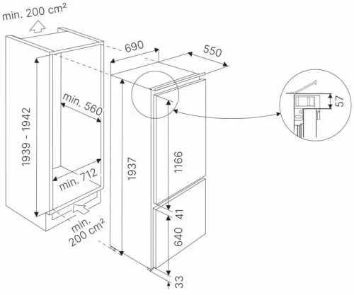 Встраиваемый прибор проще разместить в комнате, даже если общий метраж не такой уж большой. Вы можете спрятать его за декоративной панелью от мебельного фасада — советуем заранее определить нишу и заказывать панели исходя из типа крепления к двери. Способ монтажа в данной модели: жесткое крепление (система door on door) Благодаря внушительным размерам, в частности высоте, она подходит большим пространствам — просторной кухне, еврогостиной. Вы можете поменять направление открывания двери, так как упор переставляемый и ее можно перевесить на другую сторону. Такая функция открывает больше возможностей для установки. Холодильник с морозильником обладает всеми опциями, которые чаще всего ищут и выбирают покупатели. Стандартная конфигурация — универсальный вариант для любой квартиры. Количество камер: 2.