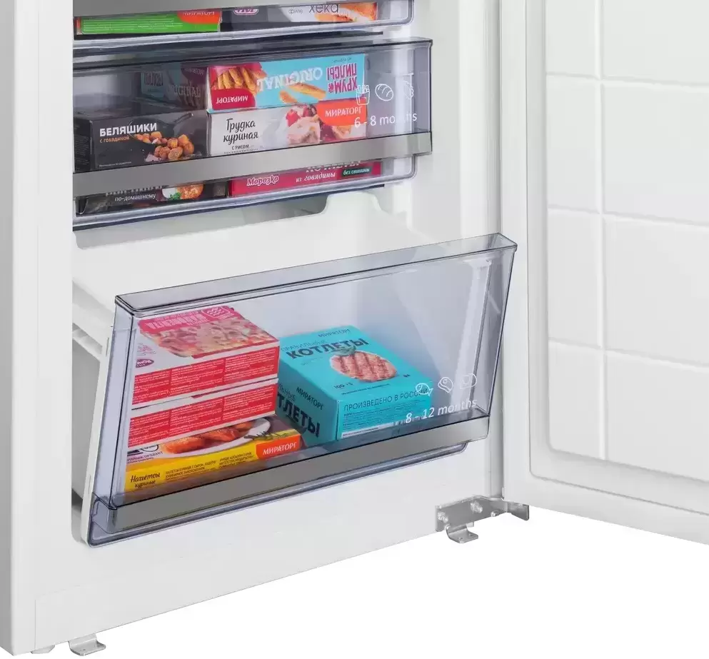 Встраиваемый прибор проще разместить в комнате, даже если общий метраж не такой уж большой. Вы можете спрятать его за декоративной панелью от мебельного фасада — советуем заранее определить нишу и заказывать панели исходя из типа крепления к двери. Способ монтажа в данной модели: жесткое крепление (система door on door) Благодаря внушительным размерам, в частности высоте, она подходит большим пространствам — просторной кухне, еврогостиной. Вы можете поменять направление открывания двери, так как упор переставляемый и ее можно перевесить на другую сторону. Такая функция открывает больше возможностей для установки. Холодильник с морозильником обладает всеми опциями, которые чаще всего ищут и выбирают покупатели. Стандартная конфигурация — универсальный вариант для любой квартиры. Количество камер: 2.