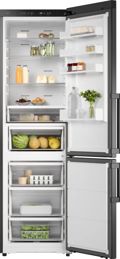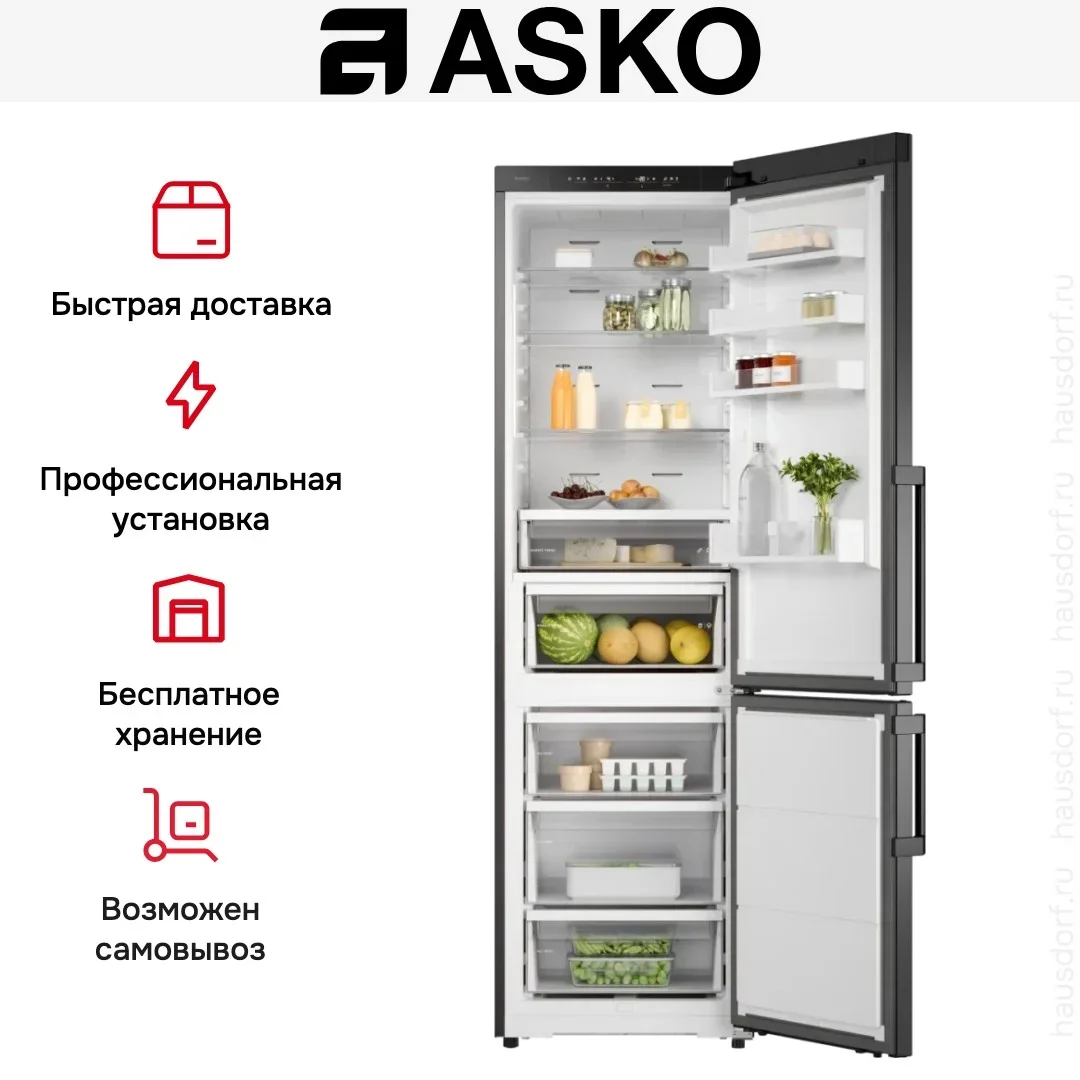 Холодильник ASKO RFC226RNB B1 — стильное и продуманное устройство серии Series 2 в цвете черная сталь, созданное для тех, кто ценит утонченность и функциональность в одном корпусе. Отдельностоящий прибор высотой 203 см, шириной 59 см и глубиной 65 см (габариты 203×59×65 см, упаковка 210×66×79 см) сочетает в себе холодильную и морозильную секции: 2 камеры с расположением низкотемпературного отсека снизу обеспечивают общую вместимость 442 л и полезный объем 388 л, при этом холодильный отсек имеет общий объем 295 л (полезный 267 л), а морозильный — 147 л (полезный 121 л). Внутренняя организация продумана до мелочей: в холодильной части три прочные стеклянные полки, четыре полки в дверце, лоток для яиц и зона свежести Nordic Fresh с двумя контейнерами для длительного хранения продуктов; морозилка оснащена тремя выдвижными ящиками, лотком для льда и функциями суперзамораживания и No Frost, что исключает образование инея и снижает необходимость ручной разморозки. Управление реализовано электронно при помощи сенсорных кнопок и LED-дисплея, предусмотрено регулирование температуры, индикация открытой двери звуковая, а при повышении внутренней температуры срабатывает световой и звуковой сигнал; также доступно приложение ConnectLife для дистанционного контроля и дополнительные режимы — Шаббат, Вечеринка и Режим очистки, плюс адаптивный температурный контроль и контроль уровня влажности для оптимального микроклимата. Технические характеристики отвечают современным требованиям: инверторный компрессор на одном блоке с экологичным хладагентом R600A гарантирует тихую работу на уровне 34 дБ, энергоэффективность класса A++ при годовом расходе 197 кВт·ч и возможность автономного сохранения холода до 13 часов; производительность замораживания достигает 13 кг/сутки. Дополнительные удобства включают возможность перевешивания дверей (упор справа по умолчанию), регулируемые ножки, ручку с гравировкой бренда и комплектную полку для бутылок на телескопических направляющих для легкого доступа. Внешний минималистичный дизайн в сочетании с антибактериальным покрытием внутри обеспечивает не только презентабельный вид, но и гигиеничность хранения, а циркуляционная система охлаждения равномерно распределяет холод по трём температурным зонам, улучшая сохранность еды и напитков; длина шнура 3 м, напряжение питания 220-240 В и частота 50-60 Гц делают установку гибкой в домашних условиях. Этот аппарат — продуманное решение для большой семьи или тех, кто любит запасаться продуктами заранее: вместительность, интеллектуальные режимы и надежные технические решения гарантируют комфорт в эксплуатации и долгий срок службы.