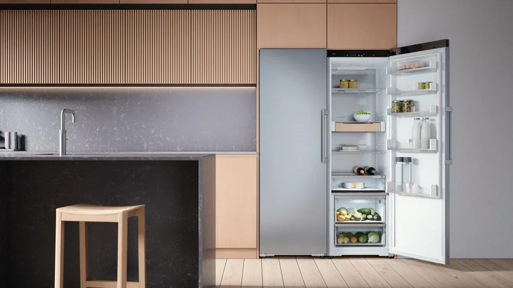 Холодильник ASKO RFR586KNCS1 — это свободно стоящий прибор высотой 185 см и компактной фронтальной базой 59×59 см, выполненный в благородном оттенке нержавеющей стали, который легко впишется в современную кухонную обстановку. Его лаконичный корпус серии 5 сочетает премиальные материалы с практичными решениями: задняя стенка из нержавеющей стали AISI 304 обеспечивает долговечность, а ручка с фирменной гравировкой и деревянные аксессуары из ясеня с масляной пропиткой добавляют тактильного и визуального уюта. Интерьер одной камеры рассчитан на общий объём 396 л и полезный объём 365 л, предлагая продуманную хранительскую организацию: пять прочных стеклянных полок, пять держателей на дверце, отдельная полка для бутылок, подставка для яиц и зона свежести DuraFresh™ с двумя контейнерами и собственной светодиодной подсветкой позволят сохранить продукты в оптимальном состоянии. Электронная система управления с сенсорными кнопками и цветным TFT-дисплеем делает настройку интуитивной: регулировка температуры, функция суперохлаждения и адаптивный контроль создают стабильный микроклимат в двух температурных зонах, а режимы Партия, Ночной режим, Шаббат и режим очистки добавляют удобства при разных сценариях использования. Прибор оснащён одним инверторным компрессором и циркуляционной системой охлаждения на экологичном хладагенте R600A, что обеспечивает тихую работу на уровне 34 дБ при высокой энергоэффективности класса A++ и годовом расходе 141 кВт·ч; длина сетевого шнура 3 м, напряжение 220-240 В, частота 50-60 Гц, максимальная потребляемая мощность при подключении 215 Вт. Для комфортного монтажа предусмотрена возможность перевешивания дверцы, регулируемые ножки, установка в стандартную нишу KitchenFit и опция Side-by-Side, а упаковочные габариты 192×66×73 см и масса нетто 69,5 кг облегчают доставку. Внутреннее LED-освещение, вентиляция и звуковой индикатор открытой двери помогают контролировать содержимое, а телескопические направляющие и комплектная полка для бутылок повышают удобство эксплуатации. Этот холодильник сочетает функциональность и стиль: продуманная эргономика, премиальные отделочные решения и расширенные режимы работы делают его привлекательным предложением для тех, кто ценит аккуратное хранение, энергоэффективность и современные цифровые опции управления через приложение ConnectLife с тактильной обратной связью, позволяя получить уверенную настройку и мониторинг в любое время. В результате вы получаете надёжное и тихое решение для хранения продуктов с высоким уровнем контроля влажности и свежести, адаптированное к повседневным потребностям и требовательной эстетике кухни, где каждый элемент — от материалов до интерфейса — продуман для долговременного использования.