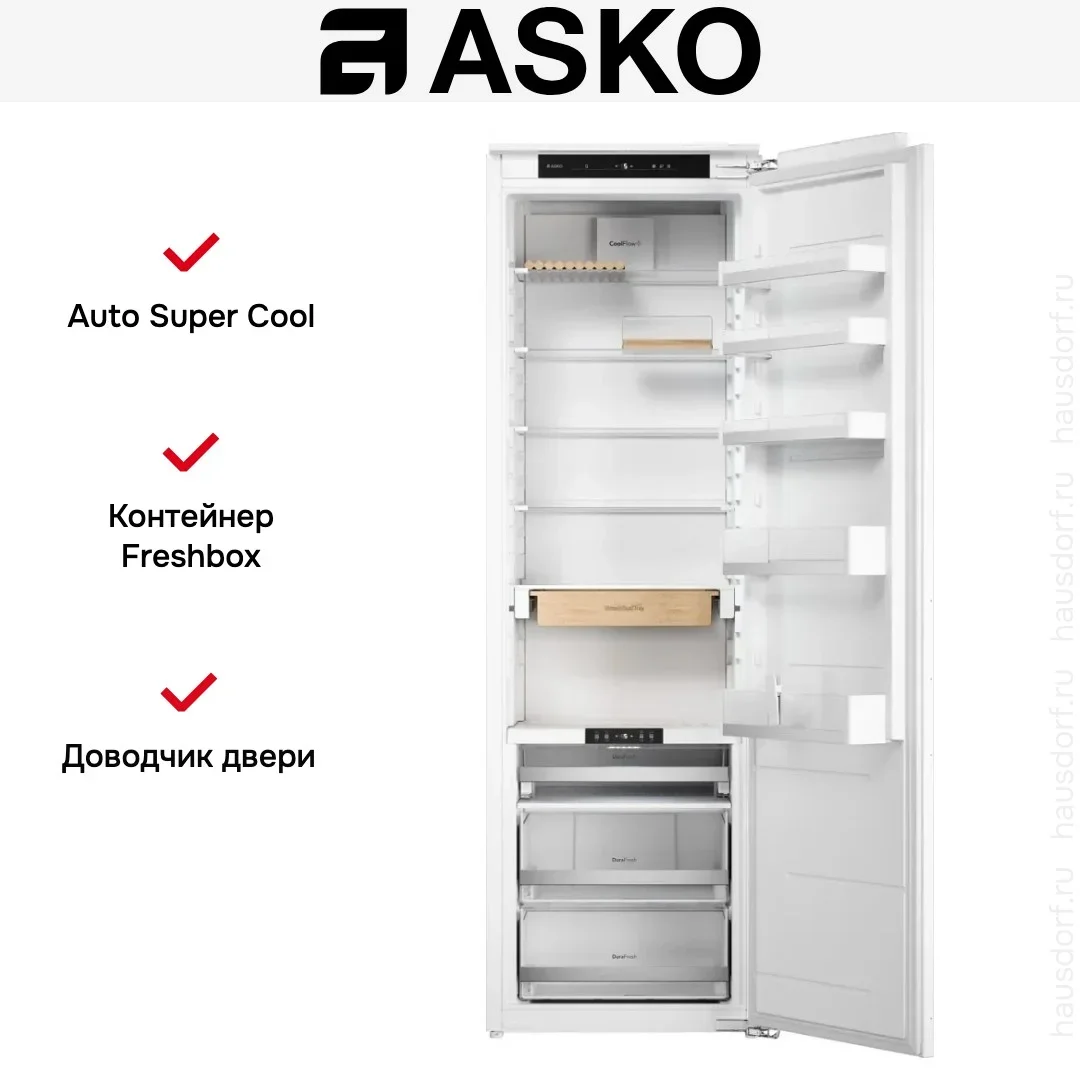 Asko R31842I — встраиваемый холодильник объемом 300 л. Имеет 5 стеклянных полок и 5 переставных на двери, оснащен зоной свежести DuraFresh™ с независимым температурным режимом. LED освещение позволяет легко ориентироваться внутри прибора. Управляется с помощью электронной панели.