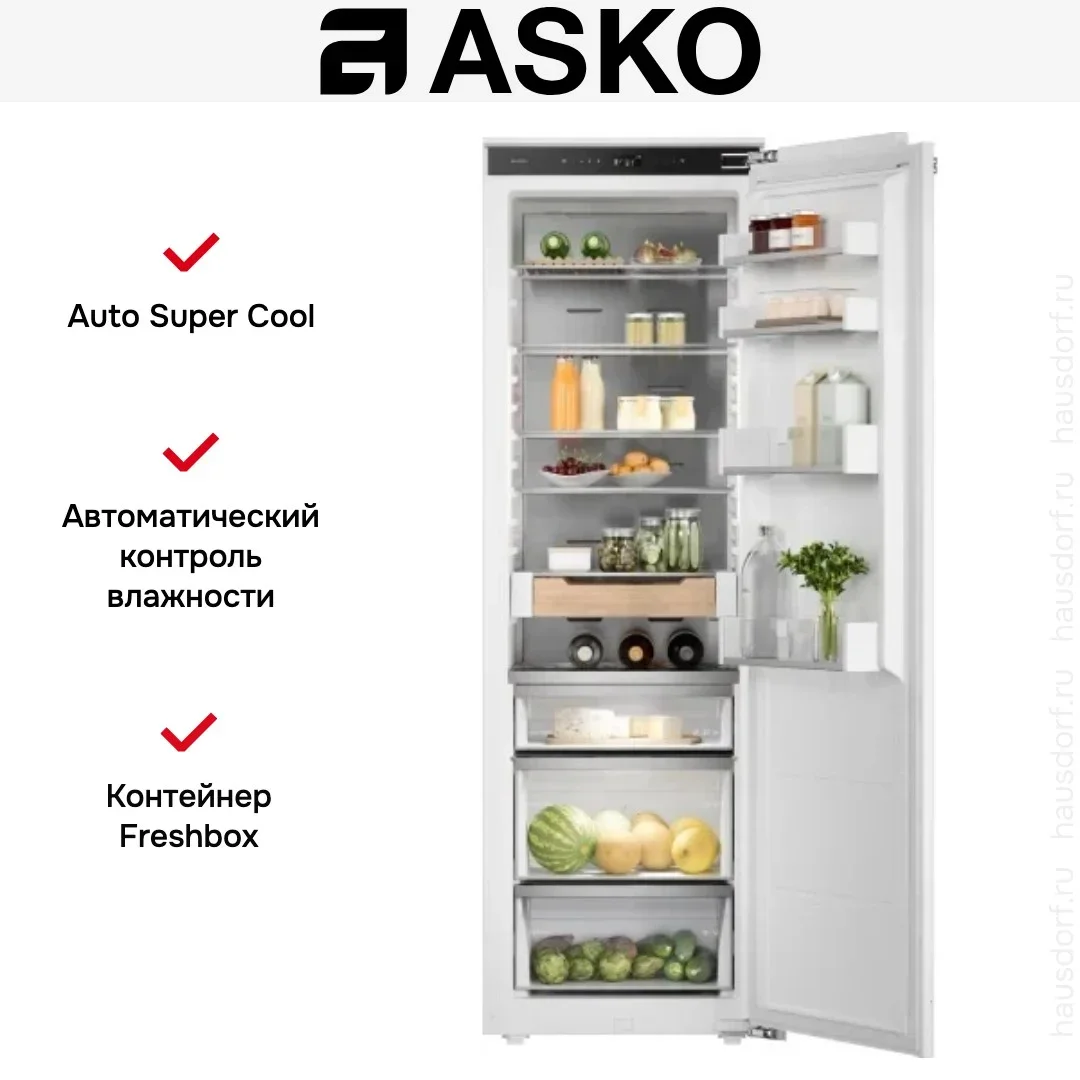 Встраиваемый холодильник ASKO RBR576DNC1 создан для тех, кто ценит аккуратность интерьерного решения и безупречную заботу о продуктах: корпус рассчитан на монтаж в нишу 177.5-178 × 56-57 × 56 см, а сам прибор занимает 177.2 × 55.7 × 54.5 см, благодаря чему легко интегрируется под фасад выбранной кухни. Модель без морозильной секции объединяет вместительность общего объёма 312 л с полезным холодным пространством 245 л, что позволяет упорядочить хранение для семьи и поддерживать отдельные температурные зоны — всего их две, включая выделенную зону свежести DuraFresh™ с тремя контейнерами и собственной светодиодной подсветкой для продуктов, требующих особого микроклимата. Внутреннее наполнение организовано четырьмя полками из прочного стекла и четырьмя держателями на дверце, есть подставка для яиц и полка для бутылок в комплекте, а телескопические направляющие обеспечивают плавное извлечение ящиков. Управление реализовано по современной схеме: электронная панель с сенсорными кнопками и TFT-дисплеем обеспечивает точную регулировку температуры, поддерживает подключение к приложению ConnectLife и сопровождается тактильной обратной связью для удобства настроек. Среди режимов — суперохлаждение для быстрого понижения температуры, адаптивный температурный контроль, контроль уровня влажности, режимы «Шаббат», «Вечеринка», «Ночной режим» и специальный цикл очистки, что делает эксплуатацию гибкой и экономичной. Технологическая основа включает инверторный компрессор с одним агрегатом и хладагентом R600A, циркуляционную систему холода и коррозионно‑стойкую заднюю стенку из нержавеющей стали AISI 304, способствующую равномерному распределению воздушных потоков и стабильной работе при широком климатическом диапазоне SN‑N‑ST‑T. Яркое и экономичное светодиодное освещение обеспечивает хорошую видимость всех уровней, а тихая работа — всего 32 дБ — не нарушит спокойствия в кухонном пространстве. Энергетическая эффективность соответствует классу A++, годовой расход составляет 125 кВт·ч, при электрических характеристиках 220-240 В и 50-60 Гц; мощность подключения 215 Вт, предохранитель 1,2 А, длина сетевого шнура 3 м. Внешняя эстетика выдержана в линейке Series 5: прибор поставляется под навес вашего фасада, дополнен деревянными аксессуарами из ясеня с масляной пропиткой и ручкой с гравировкой бренда, что придаёт мебели благородный акцент. Практичность поддержки монтажа выражена в возможности перевешивания дверцы и жёстком креплении по системе door on door для аккуратного сопряжения с фасадом; предупреждение о незакрытой двери реализовано звуковым сигналом. Для тех, кто ищет встроенное решение с продуманной организацией внутреннего пространства, интеллектуальными режимами и премиальными материалами отделки, этот холодильный агрегат станет надёжным союзником в повседневной заботе о качестве продуктов.