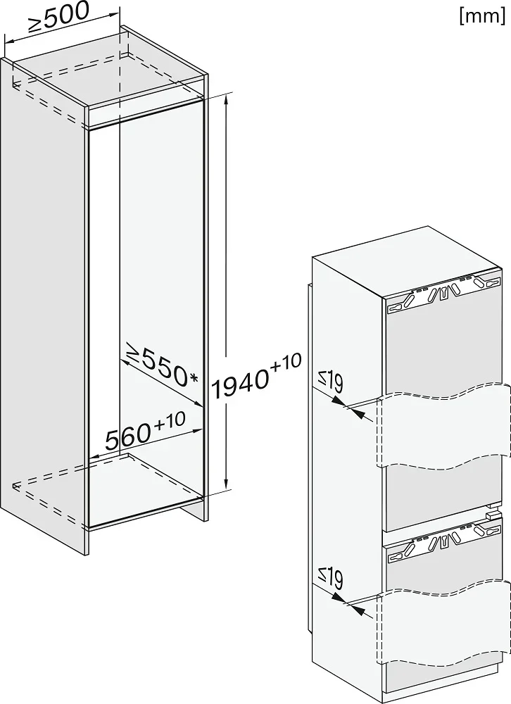 Встраиваемый холодильник Miele KFN 7844 C — элегантное устройство под фасад вашего гарнитура, рассчитанное на монтаж по системе door on door. Его габариты 193,855,954,6 см делают прибор идеальным для установки в кухонный гарнитур. Жесткое крепление двери позволяет надежно зафиксировать мебельный фасад до 18 кг, а возможность перевешивания петли дает свободу при планировке кухни.