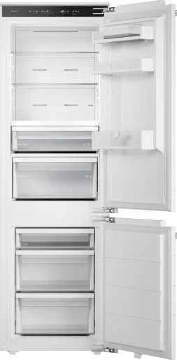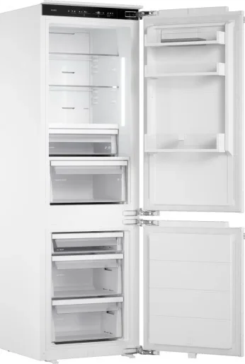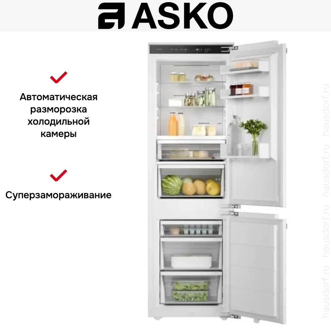 Встраиваемый комбинированный холодильник ASKO RBC276DNC1 создан для тех, кто ценит аккуратный внешний вид и продуманный внутренний порядок: строгий дизайн Series 2 легко скрывается за фасадом мебели, оставляя лишь аккуратную ручку с гравировкой, а корпус рассчитан на нишу размером 177.5-178 × 56-57 × 56 см, что обеспечивает плотную и безопасную установку по системе door on door. Высота 177.2 см при ширине 55.7 см и глубине 54.5 см делает прибор оптимальным для компактной кухни, не жертвуя вместительностью: общий объём 275 л при полезном пространстве 199 л распределён между холодильной камерой (189/142 л) и нижним отделением для заморозки (86/57 л). Продуманная зона свежести Nordic Fresh с двумя контейнерами и контроль уровня влажности обеспечивает более длительное хранение овощей, фруктов и мясных изделий, а функция суперохлаждения и режим быстрого замораживания повышают скорость подготовки продуктов при приходу больших партий покупок. Система No Frost в морозильнике убирает необходимость ручного размораживания, трёхуровневая организация ящиков и лоток для льда упрощают хранение готовых блюд и полуфабрикатов; при этом автономность сохранения холода до 9 часов даёт дополнительную защиту при временных отключениях питания, а производительность замораживания 7 кг/сутки пригодится для интенсивного использования. Умная электронная панель с сенсорными кнопками и LED-дисплеем удобна для настройки температур в трёх зонах, сохраняет параметры при сбоях и поддерживает управление через приложение ConnectLife, предоставляя дистанционный контроль и обмен статусом. Компрессор инверторного типа с хладагентом R600A работает тихо (35 дБ) и экономично: класс энергоэффективности C и годовое потребление 206 кВт·ч сочетаются с адаптивным температурным контролем и циркуляционной системой охлаждения, обеспечивающей равномерное распределение прохлады по всем полкам. Внутреннее освещение выполнено светодиодами, которые равномерно подсвечивают два стеклянных уровня в холодильной камере и четыре полки на дверце, плюс предусмотрена подставка для яиц и отдельная полка для бутылок в стандартной комплектации; телескопические направляющие облегчают доступ к тяжёлым ёмкостям. Наличие вентиляции и антибактериального покрытия поддерживает гигиену, а упомянутые режимы — Шаббат, Вечеринка и Очистка — дают пользователю гибкость в повседневных сценариях: от экономии энергии в праздники до быстрого приведения камер в порядок перед приёмом гостей. Управление температурой интуитивно и надёжно: индикация открытой двери звуковая, повышение температуры сигнализируется светом и звуком, длина электрошнура 3 м и возможность перевешивания дверей упрощают монтаж. Этот встроенный агрегат сочетает функциональные решения для сохранения свежести и удобства эксплуатации, сохраняя при этом аккуратный внешний вид, который бесшовно интегрируется в интерьер любой кухни.