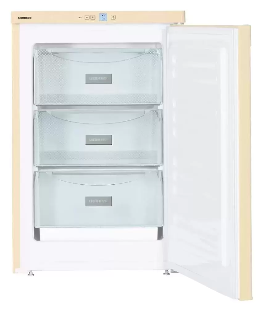 Отдельно стоящая модель высотой 85 см может быть размещена под столешницей. Прибор подойдет также для установки вплотную к стене или в готовую нишу. Корпус универсального бежевого цвета изготовлен из стали и снабжен интегрированной ручкой. Над дверцей располагается электронная панель управления с ЖК-дисплеем MagicEye с графической индикацией температуры. Общий объем рабочей камеры составляет 101 литр. Внутреннее наполнение составляют три герметично закрывающихся прозрачных выдвижных контейнера FrostSafe, превосходно сохраняющих холод даже при частом открытии дверцы морозильной камеры. Прозрачная фронтальная часть способствует хорошему обзору хранящихся продуктов. Если необходимо заморозить большие упаковки или крупные продукты, поможет система VarioSpace, благодаря которой все стеклянные полки и контейнеры без труда извлекаются из морозильного отделения. Производительность замораживания достигает 11 кг продуктов в сутки. При отключении электроэнергии возможно автономное сохранение холода на протяжении 26 часов. Предохранить продукты от случайного изменения настроек позволит функция защиты от детей. Уровень шума составляет всего 40 дБ.