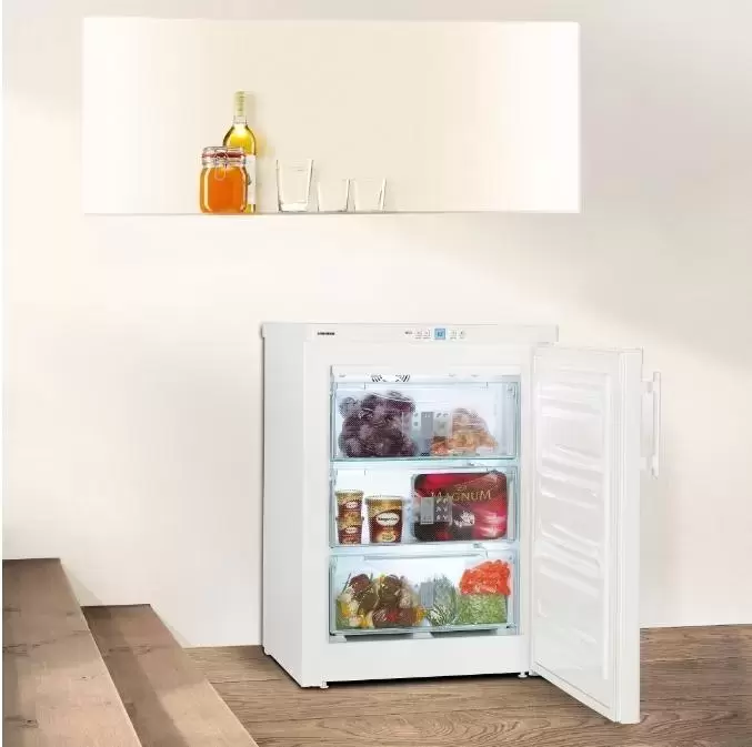 Морозильник Liebherr GN 1066 Premium — небольшая отдельно стоящая модель с широким набором функций. Прибор высотой 85,1 см и шириной 60,2 см оснащен крышкой, которую можно использовать в качестве стола. При установке устройства в готовую нишу крышку можно без труда снять. Правый упор двери легко перенавешивается на левую сторону. Корпус белого цвета изготовлен из стали, глянцевый фасад снабжен ручкой со встроенным толкателем. Общий объем камеры составляет 91 литр, а производительность замораживания достигает 14 кг продуктов в сутки. В камере находятся три контейнера FrostSafe из пластика со специальным покрытием, препятствующим примерзанию продуктов к стенкам. Система VarioSpace позволяет извлекать контейнеры из морозильника для размещения в нем продуктов большого размера. Функция суперзамораживания SuperFrost с автоматическим выключением через 65 часов поможет быстро заморозить свежие продукты, сохранив все их полезные свойства. Технология NoFrost предотвращает образование инея на стенках и облегчает уход за прибором.