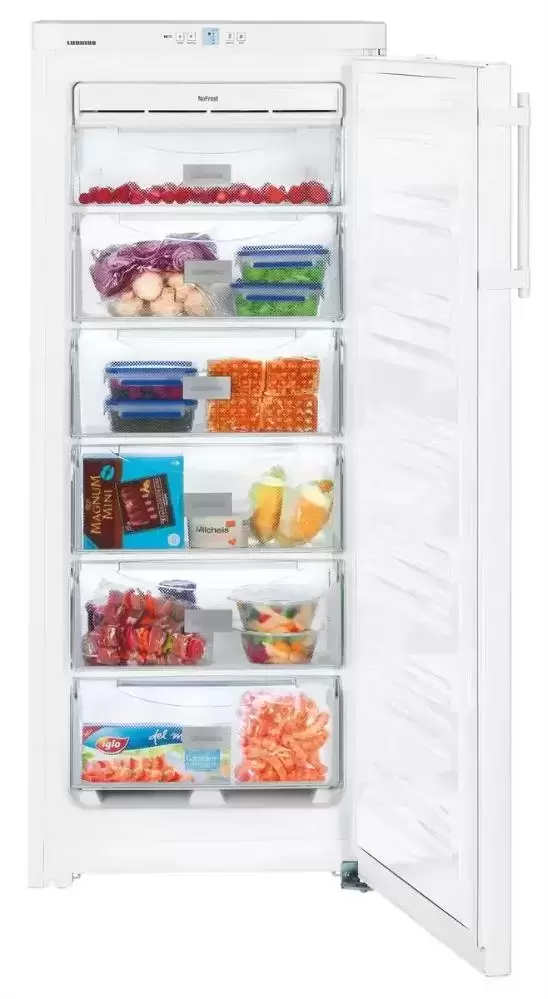 Морозильник Liebherr GN 2323 Comfort NoFrost станет хорошим дополнением к холодильнику с небольшой морозильной камерой. Высота 144 см, ширина 60 см, возможность установки вплотную к стене и перенавешиваемая дверца позволят разместить его даже в малогабаритной кухне. Камера объемом 226 литров имеет удобное внутреннее наполнение: 6 стеклянных полок и 6 выдвижных закрытых контейнеров FrostSafe с прозрачной передней частью, а также отделение для хранения трав и ягод. Система Vario позволяет без труда извлекать полки и ящики, если требуется разместить продукты большого размера. Корпус изготовлен из стали и окрашен в классический белый цвет, фронтальная часть имеет эффектное глянцевое покрытие. Режим суперзамораживания SuperFrost с автоматическим отключением через 65 часов поможет подготовиться к закладке на хранение большого количества продуктов путем быстрого снижения температуры. Над дверцей расположена интуитивно понятная панель управления MagicEye класса Comfort с кнопками SoftTouch и дисплеем с цифровой индикацией температуры.