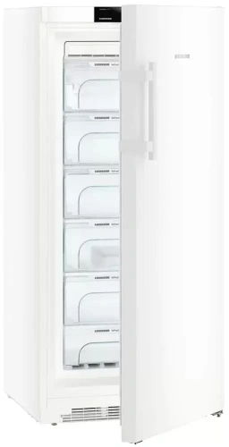 Морозильник высотой 155 см отличает достаточно большой объем 309 литров, стальной корпус белого цвета и эргономичная ручка со встроенным толкателем. Допускается установка прибора вплотную к стене или в готовую нишу для экономии места. Уплотнитель дверцы можно без труда заменить для более плотного закрытия. Дополнительно на него можно установить систему SmartGrid ready, которая сокращает затраты на электроэнергию благодаря более интенсивной работе компрессора в часы с наименьшим тарифом. Еще один дополнительный модуль SmartDeviceBox отвечает за дистанционное управление параметрами работы со смартфона. За дверцей находится электронная панель управления с сенсорными кнопками, 2,4-дюймовым сенсорным монохромным TFT-дисплеем и индикатором статуса, который меняет цвет, если температура в камере повышена. Продукты размещаются в закрытых стеклянных контейнерах FrostSafe с прозрачной фронтальной частью, которые отлично удерживают холод. Для сохранения продуктов в замороженном виде при отключении электроэнергии на протяжении 20 часов используются аккумуляторы холода. Производительность замораживания составляет 22 кг продуктов в сутки.