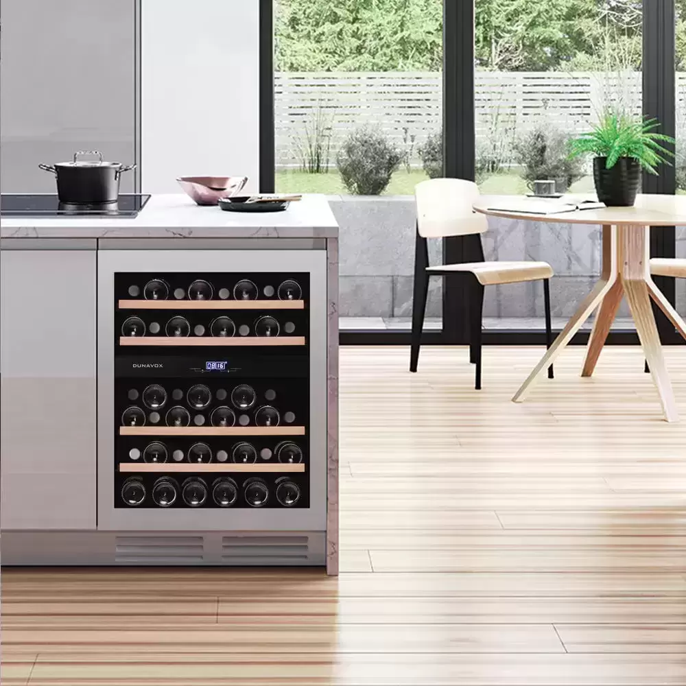 Винный шкаф Dunavox DAUF-45.125DSS.TO представлен в цвете нержавеющая сталь, что позволяет его комбинировать не только с другой бытовой техникой, но и интегрировать в разнообразные интерьерные решения. Устройство относится к встраиваемым изделиям, то есть устанавливается в специальную мебельную нишу, за счет чего смотрится стильно, современно и эстетично. Наличие двух температурных зон позволяет сохранить вина с различными условиями по температуре и уровню влажности. Все настройки задаются с сенсорной панели управления, которая отличается легкостью понимания за счет небольшого количества кнопок и графических подсказок, которые помогают быстро сориентироваться в параметрах. Внутри винного шкафа Дунавокс DAUF-45.125DSS.TO — деревянные полочки, которые выдерживают большие нагрузки и отличаются длительным сроком службы.