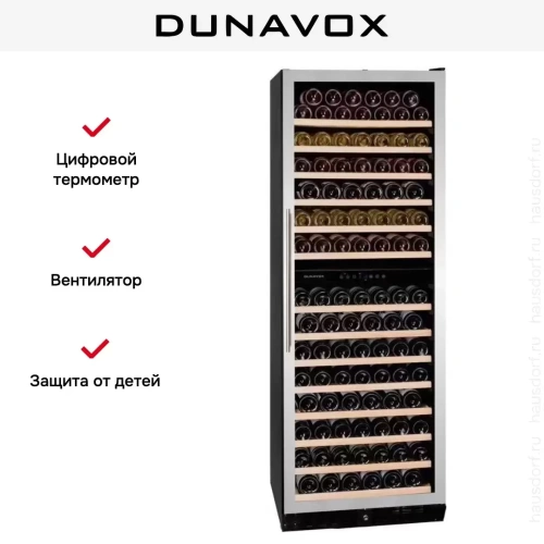 Винный шкаф Dunavox DX-181.490SDSK — большая и вместительная модель, которая подойдет как для домашнего хранения, так и для бизнеса. Устройство вмещает до 181 бутылки стандартного объема. Их с комфортом можно разместить на деревянные полочки, которые отличает высокая прочность. Внутри представлено две зоны с индивидуальными настройками, что расширяет возможности прибора. Стеклянная дверца смотрится стильно и современно, а внутренняя подсветка дополняет лаконичный образ модели. Тонировка защищает от попадания ультрафиолетового излучения, которое негативно влияет на качество напитка. Винный шкаф Дунавокс DX-181.490SDSK оснащен разнообразными опциями, которые повышают безопасность эксплуатации. Среди них: световая индикация открытой двери, защита от детей и замок. В комплект входит подробная инструкция.