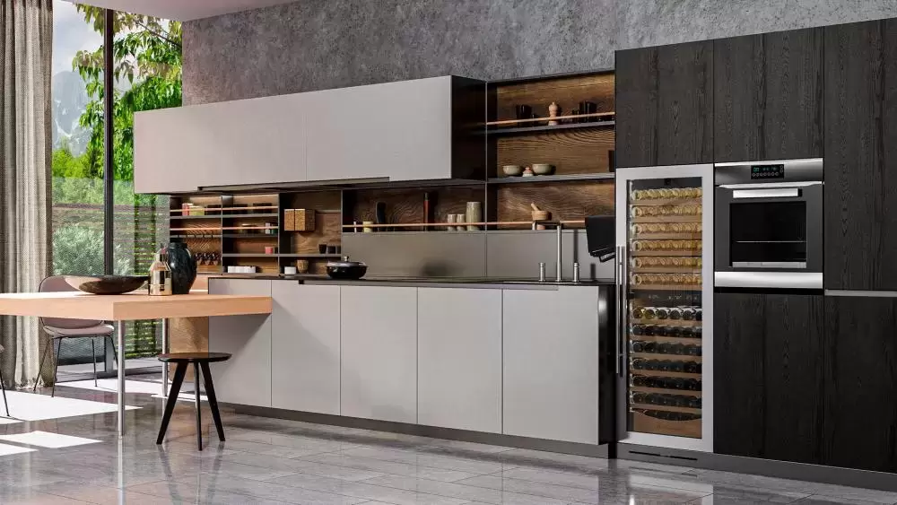 Стеклянная дверь — дополнительный изящный штрих к общему дизайну модели. Специальное покрытие защищает вино от влияния ультрафиолетовых лучей, которые проникают, если шкаф находится в солнечной комнате. Хранение становится еще безопаснее и герметичнее благодаря нескольким слоям стекол. Цвет корпуса — черный. Дверь можно перевесить на другую сторону, поэтому вариантов размещения его в доме становится больше.
