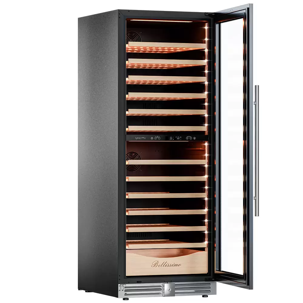 Винный холодильник Meyvel MV141PRO-KST2 имеет две температурные зоны, в которых одновременно можно хранить разные сорта алкоголя и выставлять разные сочетания настроек. Он устанавливается отдельно, что удобно, если у вас есть специальное помещение — кладовая, погреб и т.д. Количество бутылок, которое можно разместить с учетом полной комплектации и из расчета объема бутылки 0,75 л, — 143 шт.
