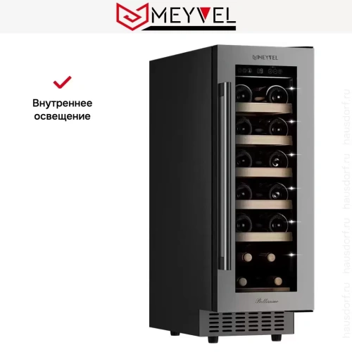 Винный шкаф Meyvel MV19-KST1 — компактная модель для правильного хранения напитков. Внутри поддерживаются оптимальные условия (по температуре и влажности), которые благоприятно воздействуют на вино, бережно сохраняя его вкус и запах. На деревянных полках можно разместить до 19 бутылок. Это хорошее значение для домашней эксплуатации. Настройка параметров работы происходит с электронной панели управления, которая располагается сверху, за дверцей. Сенсорные кнопки легко нажимаются, а на дисплее демонстрируется необходимая информация о работе устройства. Благодаря тонировке на двери блокируется попадание ультрафиолетового излучения, которое пагубно влияет на вино. Благодаря вентиляции внутри не скапливаются запахи, которые могут попасть в напиток через пробку. В винном шкафу Мейвел MV19-KST1 предусмотрено светодиодное освещение.
