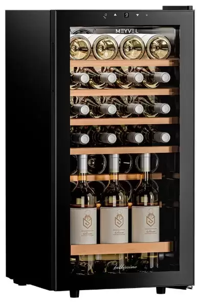 Винный холодильник Meyvel MV28-KBF1 имеет одну температурную зону, в которой можно разместить бутылки и единовременно выставить только одну комбинацию настроек. Он устанавливается отдельно, что удобно, если у вас есть специальное помещение — кладовая, погреб и т.д. Благодаря компактным размерам данная модель — отличный выбор для офиса, гостиничного номера. Количество бутылок, которое можно разместить с учетом полной комплектации и из расчета объема бутылки 0,75 л, — 28 шт.