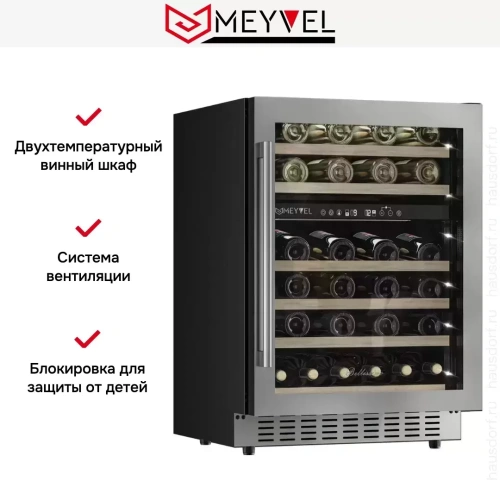 Винный шкаф Meyvel MV46PRO-KST2 — компактная модель, которая при своих небольших габаритах способна вместить до 46 бутылок. Помимо хороших возможностей по расположению напитков, прибор имеет две температурные зоны, поэтому можно размещать напитки с различными условиями для хранения. Настройки происходит при помощи сенсорной панели управления и цифрового дисплея. Все элементы имеет графические подсказки, легко активируются легким нажатием. Полки легко выдвигаются, что обеспечивает удобную загрузку и выгрузку. Они выполнены из массива бука, что делает их прочным, надежным и долговечным решением. Прибор оборудован как панорамным, так и демонстрационным освещением. Тихая работа — еще одно преимуществ винного шкафа Мейвел MV46PRO-KST2. Уровень шума не превышает 40 дБ, что является хорошим значением, которое не создает дискомфорт для пользователя.