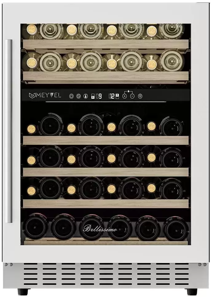 Винный холодильник Meyvel MV46PRO-KWT2 имеет две температурные зоны, в которых одновременно можно хранить разные сорта алкоголя и выставлять разные сочетания настроек. Он устанавливается отдельно, что удобно, если у вас есть специальное помещение — кладовая, погреб и т.д. Благодаря компактным размерам данная модель — отличный выбор для офиса, гостиничного номера. Количество бутылок, которое можно разместить с учетом полной комплектации и из расчета объема бутылки 0,75 л, — 46 шт.