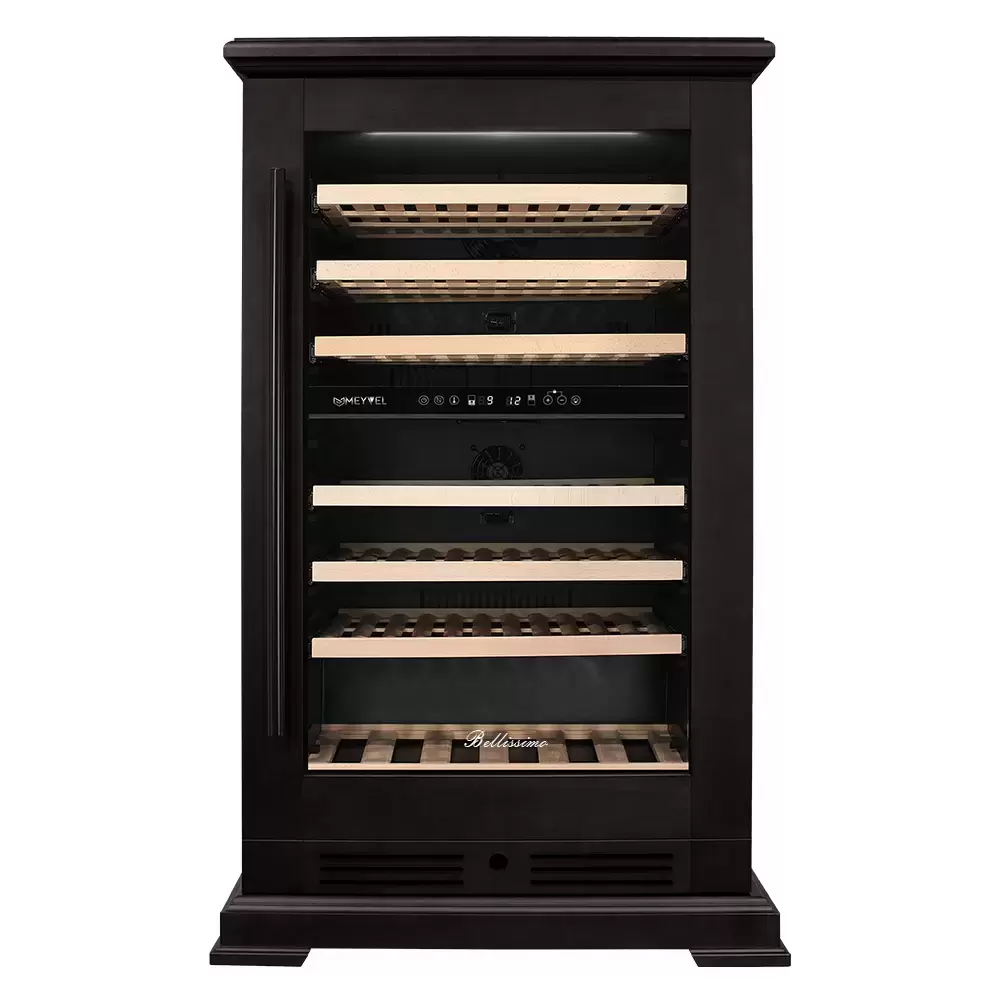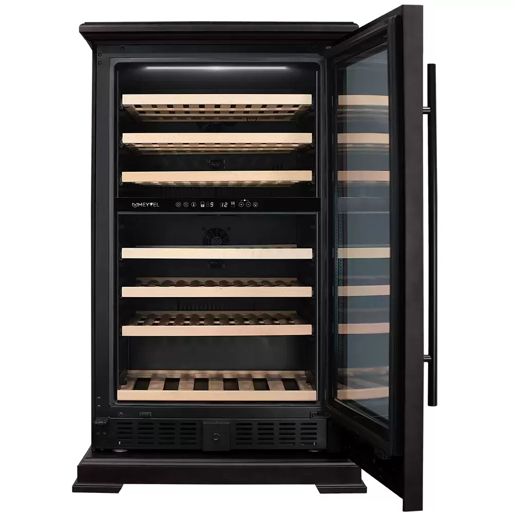 Винный холодильник Meyvel MV77PRO-KBT2 (Тёмный шоколад) имеет две температурные зоны, в которых одновременно можно хранить разные сорта алкоголя и выставлять разные сочетания настроек. Он устанавливается отдельно, что удобно, если у вас есть специальное помещение — кладовая, погреб и т.д. Количество бутылок, которое можно разместить с учетом полной комплектации и из расчета объема бутылки 0,75 л, — 77 шт.