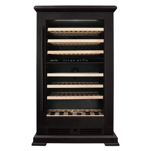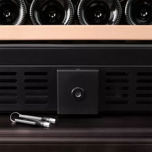 Стеклянная дверь — дополнительный изящный штрих к общему дизайну модели. Специальное покрытие защищает вино от влияния ультрафиолетовых лучей, которые проникают, если шкаф находится в солнечной комнате. Хранение становится еще безопаснее и герметичнее благодаря нескольким слоям стекол. Цвет корпуса — темный шоколад.