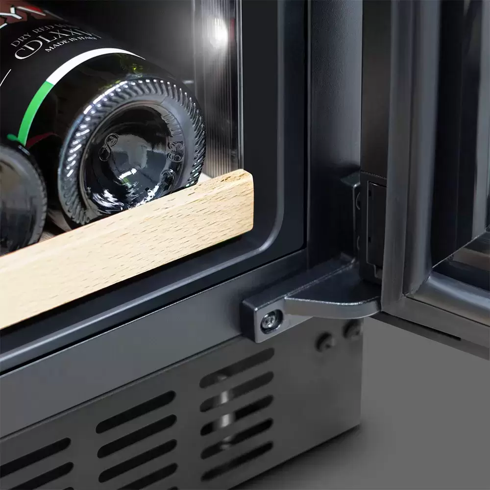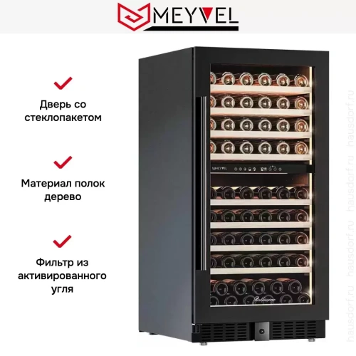 Винный шкаф Meyvel можно установить отдельно или в нишу — при этом между корпусом прибора и мебелью должен быть зазор, а на дверь нельзя устанавливать декоративный фасад. Эта модель подойдет как для домашнего использования, так и для размещения в ресторане или гостинице. Камера разделена на две температурные зоны, поэтому вы можете одновременно хранить разные сорта — каждый в индивидуальных условиях. По всему внутреннему пространству поддерживается влажность на уровне 60-80%, чтобы пробки не пересыхали и не нарушали герметичность.