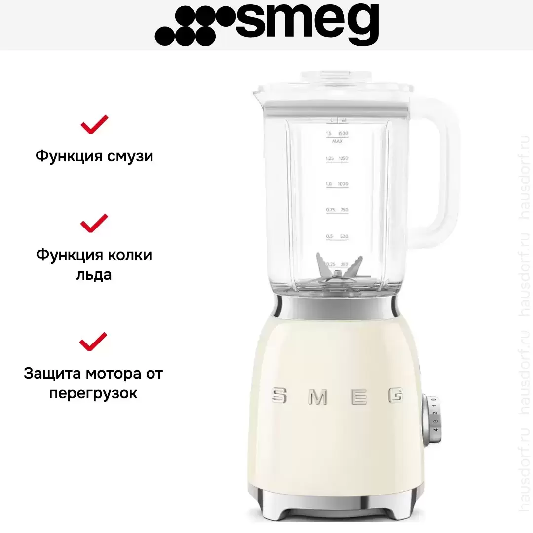 Блендер Smeg BLF03CREU — это идеальное сочетание элегантного дизайна в стиле 50-х годов и высокой технологичности. Кремовый цвет корпуса, выполненного из литого алюминия, придает изысканность, а также обеспечивает его долговечность и надежность. Мощность 800 Вт и максимальная скорость вращения в 18000 об/мин позволяют справляться с любыми задачами. Он может легко измельчить овощи и фрукты, приготовить смузи или колоть лед. Съемное двойное лезвие из нержавеющей стали обеспечивает равномерное измельчение продуктов, а также подходит для льда.
