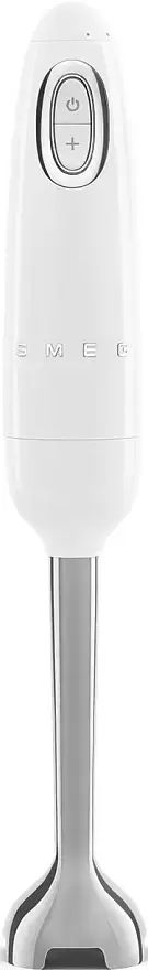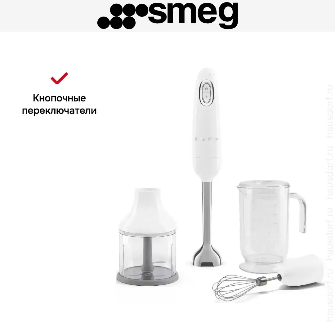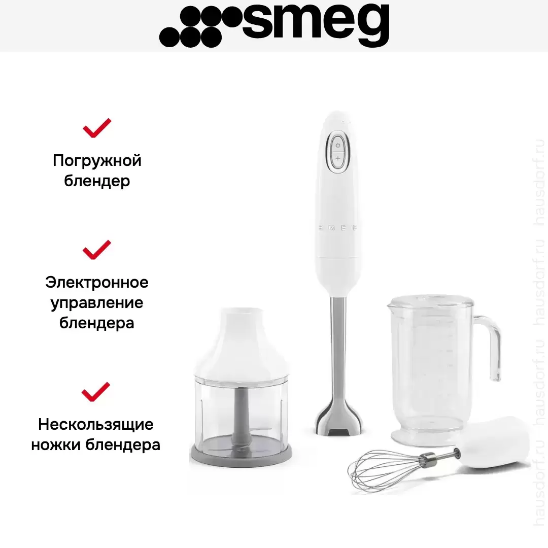 Погружной блендер Smeg позволяет готовить смузи, коктейли, смешивать соусы и заправки и многое другое. Такая конструкция требует вашего участия — нужно держать рукоятку с насадкой и контролировать направление движения. Плюс в том, что можно использовать ее прямо в кастрюле, когда готовите, например, суп-пюре. Корпус сделан в основном из пластика, что уменьшает вес прибора. Он может как влиться в общую гамму интерьера, так и стать ярким акцентом; доминирующий цвет — белый. Благодаря специальным нескользящим ножкам блендер сохраняет устойчивость даже на высоких оборотах.