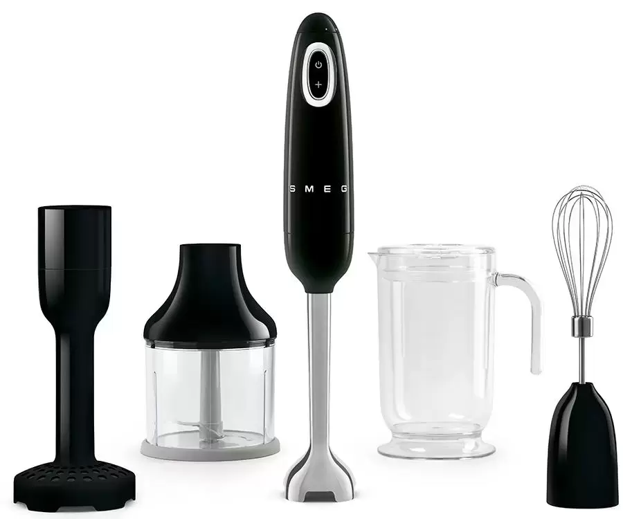 Переключатели выполнены в форме кнопок, что делает управление интуитивно понятным. Возможна плавная регулировка скорости вращения, что позволяет выбирать оптимальный режим для каждой конкретной задачи. В комплект входят различные аксессуары: измельчитель, насадка для пюре, насадка-венчик и ножи из нержавеющей стали с системой FlowBlend. Это позволяет использовать прибор для различных кулинарных задач — от приготовления пюре и смузи до взбивания кремов и белков.