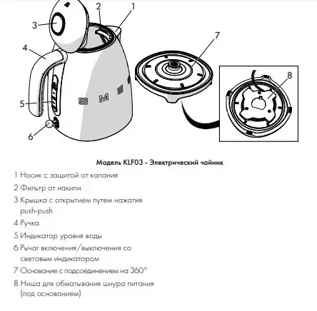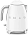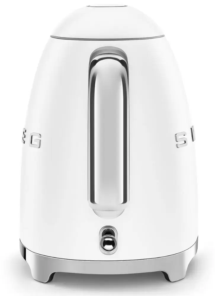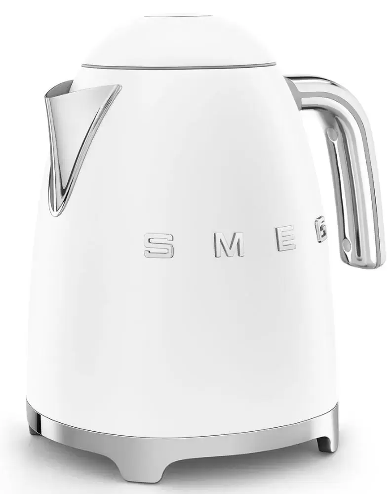 Электрический чайник Smeg KLF03WHMEU весом 1,6 кг и высотой 25 см принадлежит к коллекции в стиле 50-х годов 20 века. Корпус и крышка матового белого цвета изготовлены из нержавеющей стали, а носик с фильтром — из полированной стали. Пластиковая ручка надежно предохраняет пользователей от ожогов. Объем рассчитан на приготовление 7 чашек чая — такая модель подойдет для большой семьи. Мощность чайника Смег KLF03WHMEU составляет 2400 Вт и гарантирует минимальное время закипания.