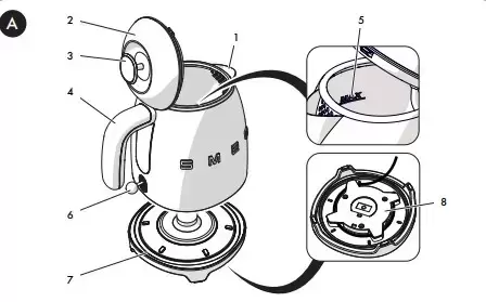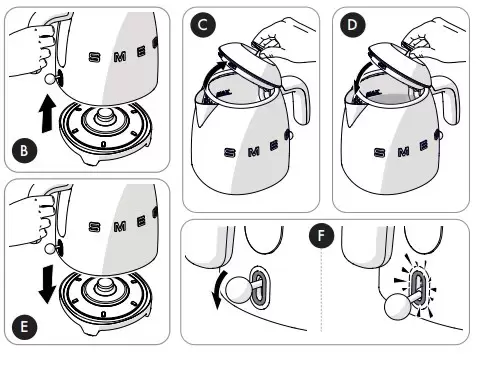 Для включения достаточно нажать на рычаг, расположенный под ручкой. Выше рычага находится окошко с отметками уровня воды. При закипании и при снятии с базы чайник Смег KLF05WHEU автоматически выключается.