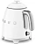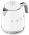 Чайник Smeg KLF05WHEU высотой 20 см, весом 1 кг и объемом всего 0,8 литра — лучший выбор для семей из двух-трех человек, для выездов на дачу и на природу. Его можно использовать в офисе или в командировке — благодаря мощности 1400 Вт он закипает очень быстро. Чайник оснащен скрытым нагревательным элементом, так что в нем не образуется накипь. Дополнительную защиту обеспечивает съемный фильтр из нержавеющей стали, который можно мыть в посудомоечной машине. Мини-чайник в белом корпусе округлой формы с удобной плотной крышкой и эргономичной ручкой — часть коллекции в стиле 50-х годов 20 века. Изготовитель предлагает множество кухонных приборов такого дизайна, так что оформить кухню в ретро-стиле не составит труда. В корпусе из термостойкого полимера находится прочная и гигиеничная стальная колба. Носик изготовлен из стали, а блестящая ручка и основание отделаны хромом.