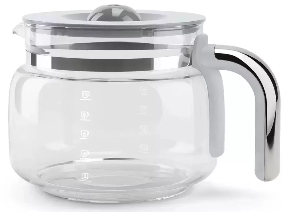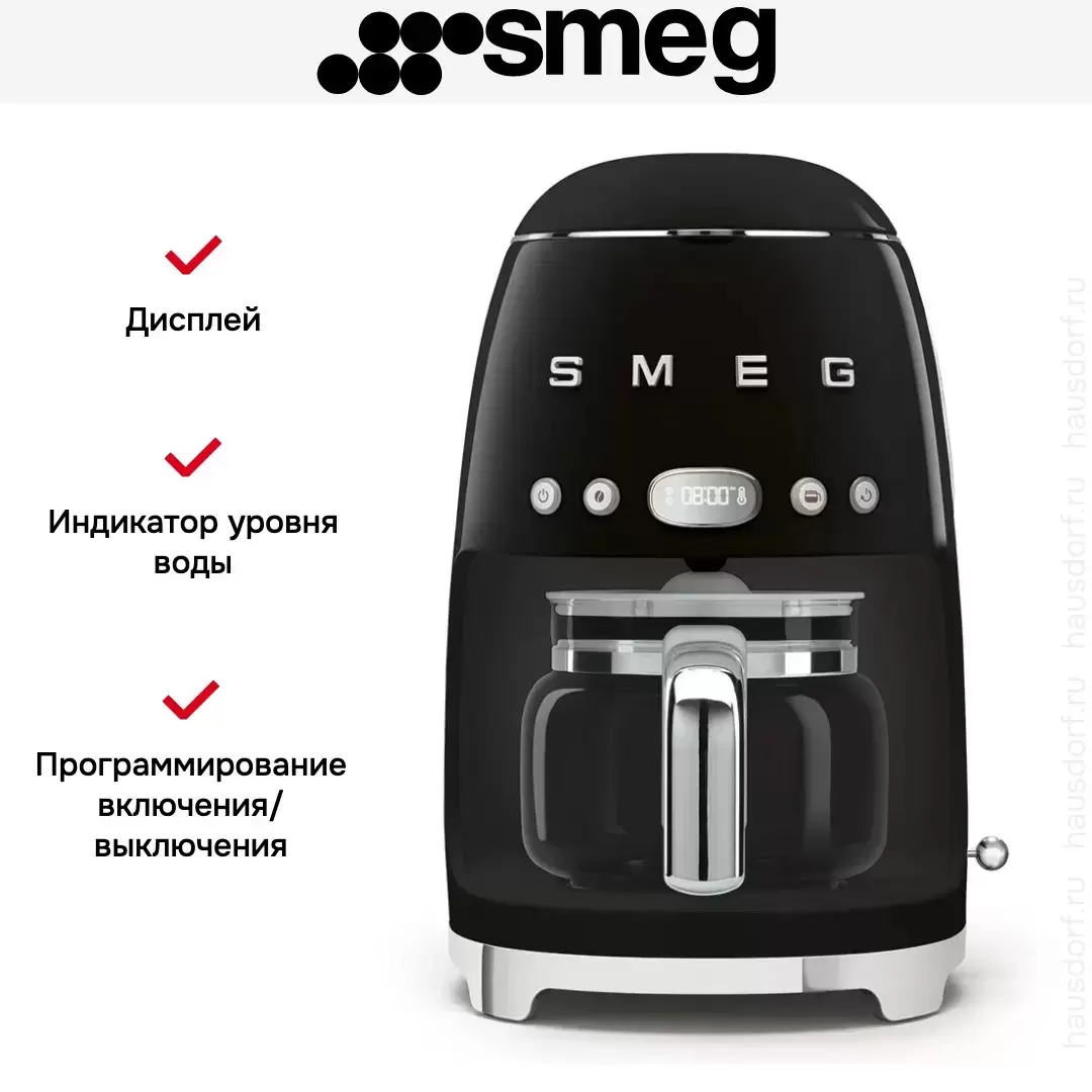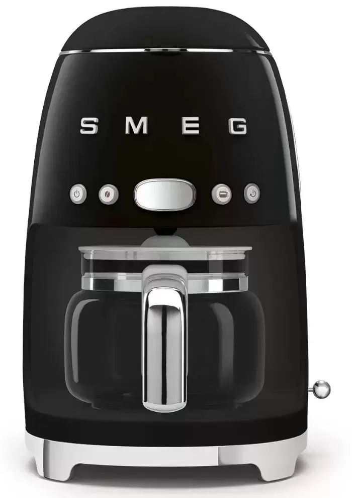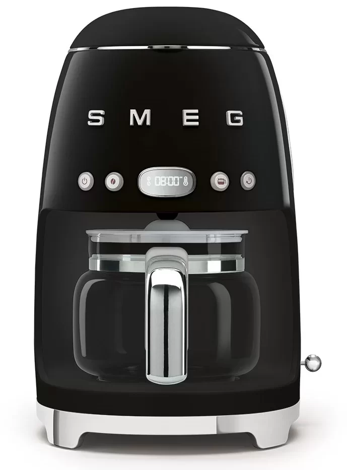 Капельная кофемашина Smeg в стиле 50-х готовит крепкий американо. В кувшин помещается до 10 порций. Можно выбрать функцию 4 чашки, чтобы сварить сколько нужно. Регулировка времени, поддержание тепла в течение 20 минут — удобные функции для быстрого завтрака.