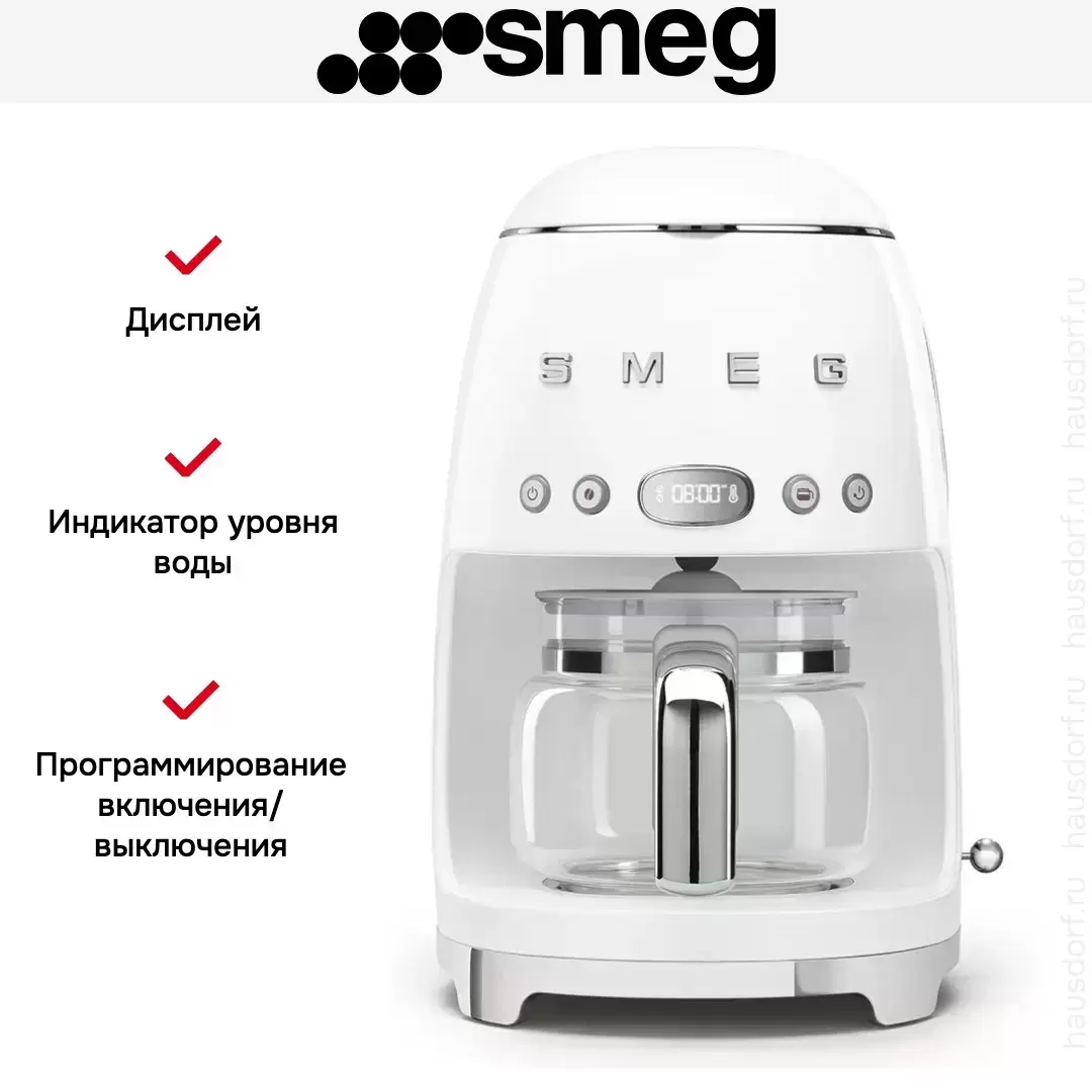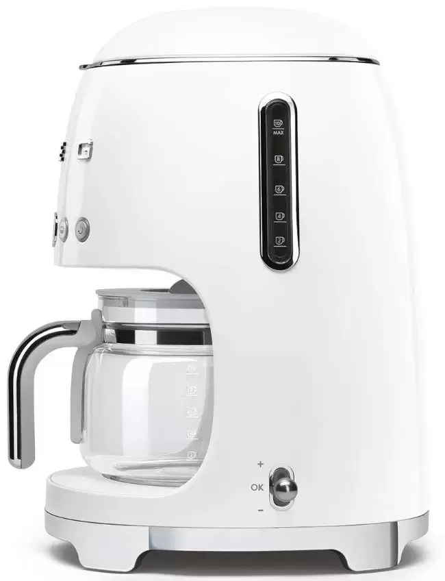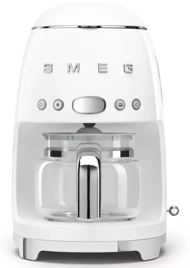Капельная кофемашина Smeg в стиле 50-х готовит крепкий американо. Вы можете сделать до 10 порций или сэкономить время и выбрать функцию 4 чашки. Кувшин с кофе снимается, благодаря плотной крышке тепло не уходит. Отдельно стоящая компактная модель выполнена в белом цвете. Для приготовления напитка используется молотый кофе. Пользователь может отрегулировать крепость напитка, а также установить жесткость воды для лучшего заваривания. Предусмотрено автоматическое включение машины в заранее выбранное время. В верхней части корпуса находятся кнопки выбора параметров работы и дисплей с часами. Функция поддержания тепла в течение 40 минут поможет получить чашку горячего напитка в любое время. Уход за прибором не составляет труда с автоматическими программами очистки и промывки от накипи.