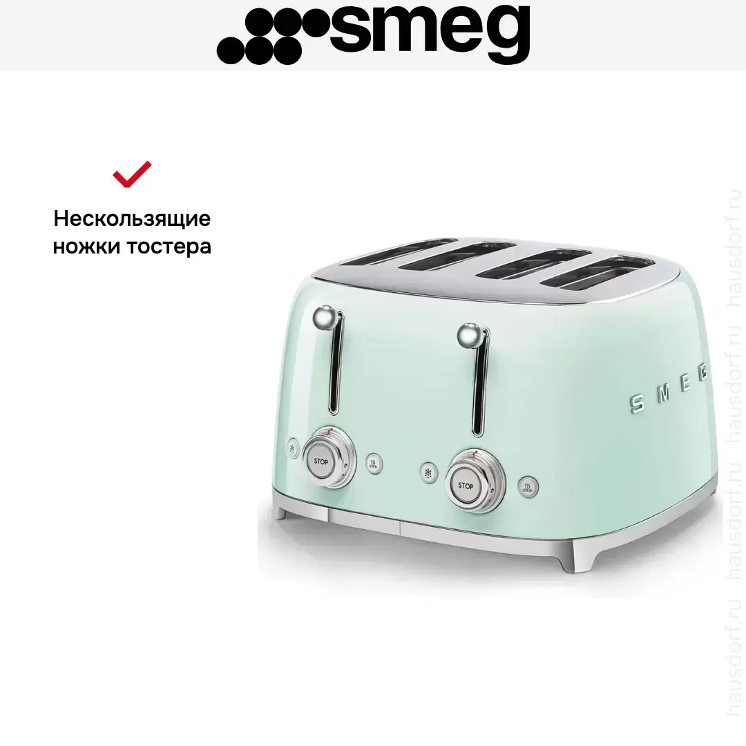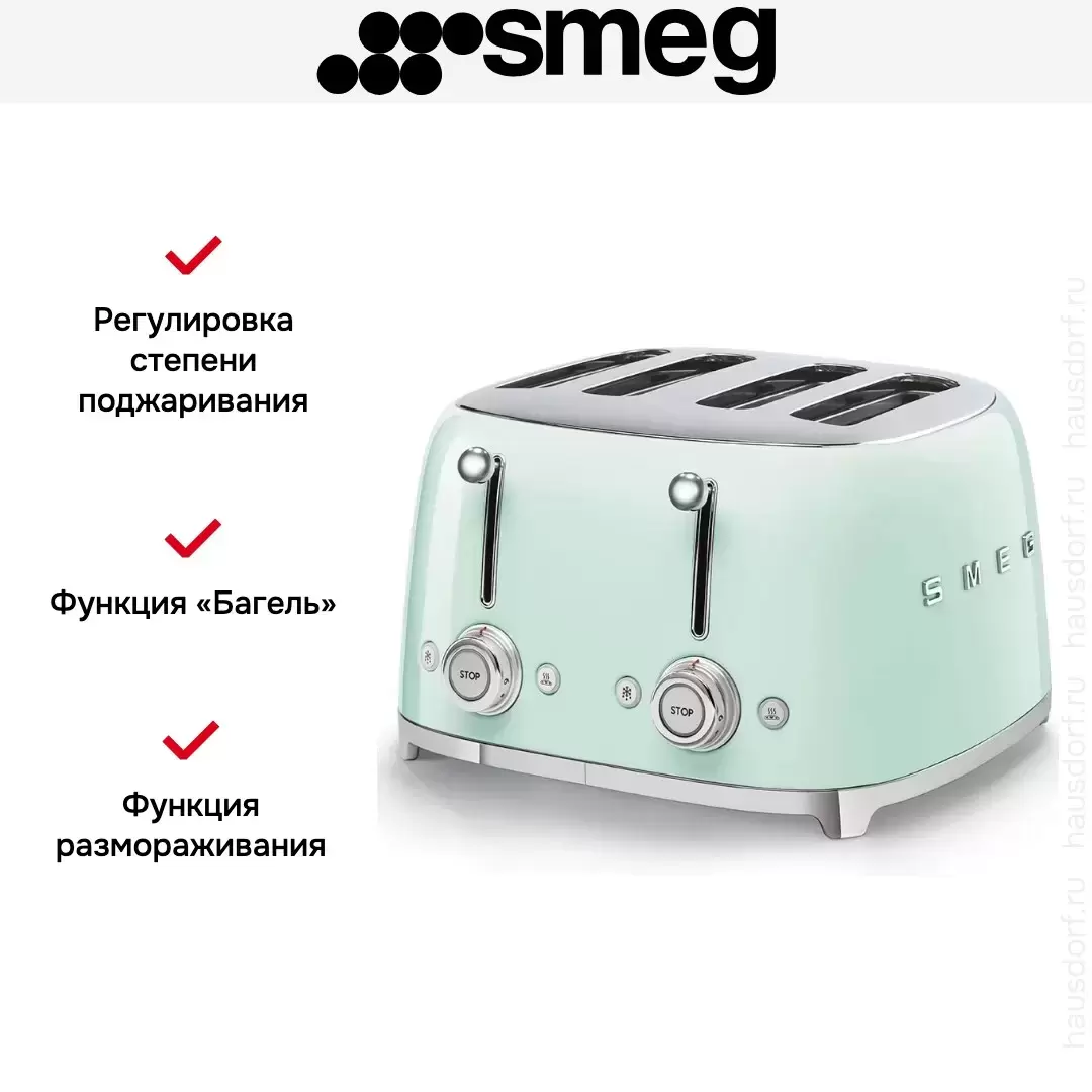 Тостер Smeg TSF03DGEU в корпусе из нержавеющей стали с эмалью нежного пастельно-зеленого цвета станет украшением как современной, так и ретро-кухни.