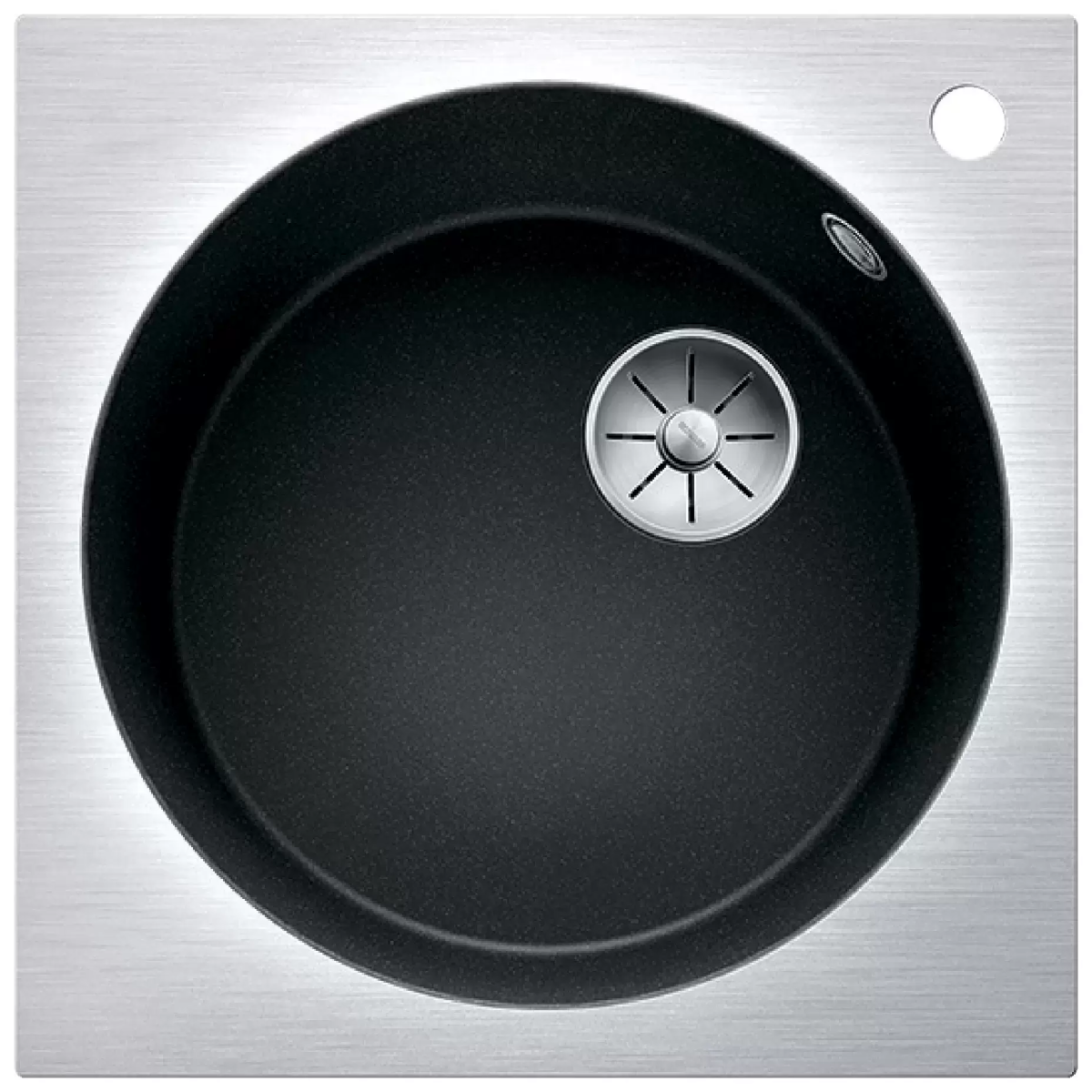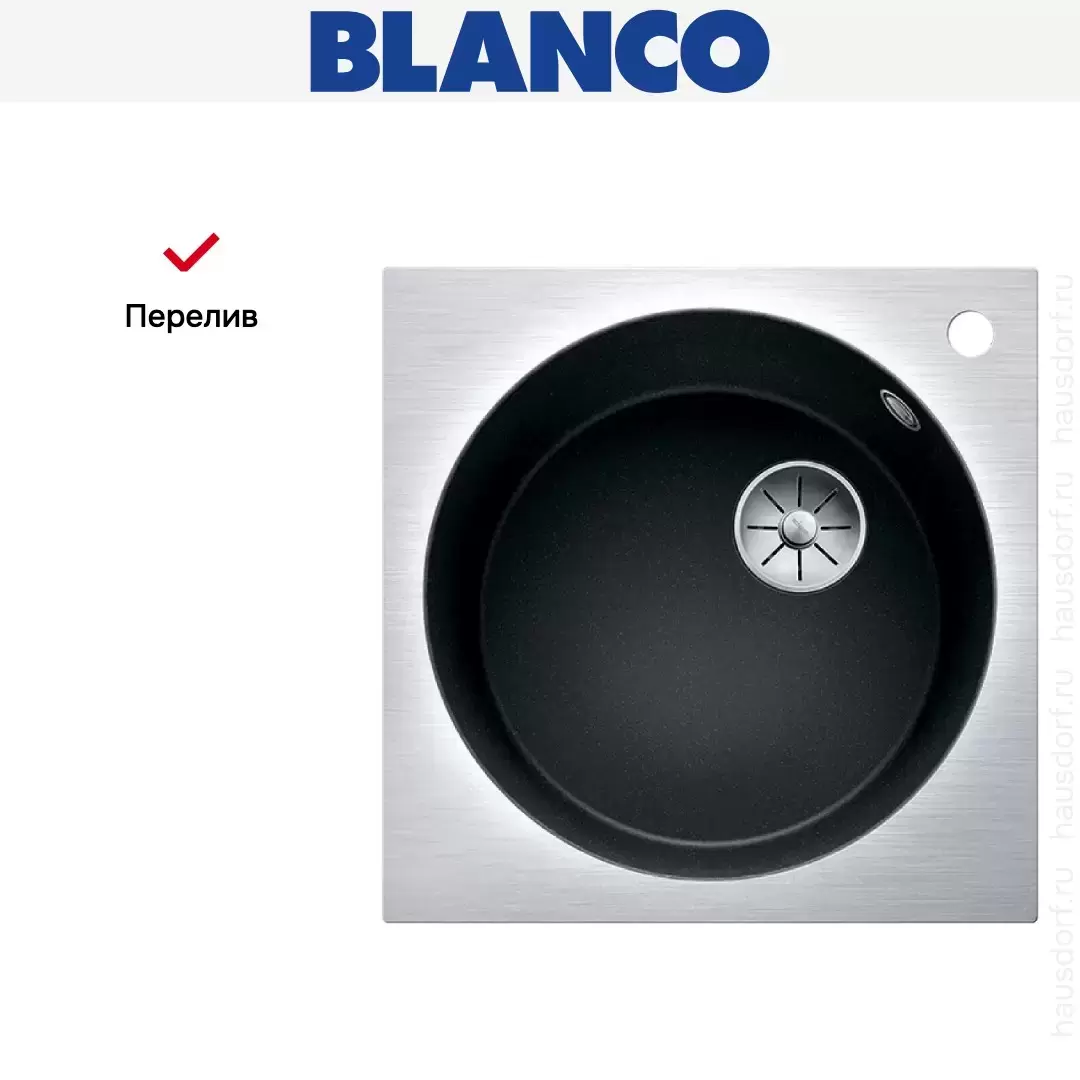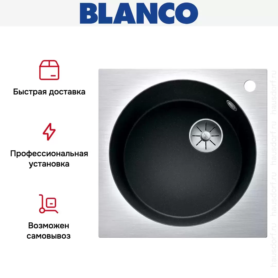 Blanco ARTAGO 6-IF/A — гранитная мойка со скрытым переливом C-overflow® и отводной арматурой InFino®. Круглая чаша модели дополнена квадратной внешней рамкой из нержавеющей стали.