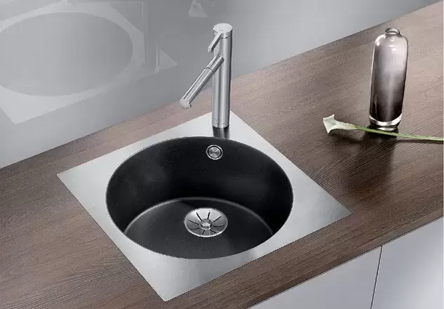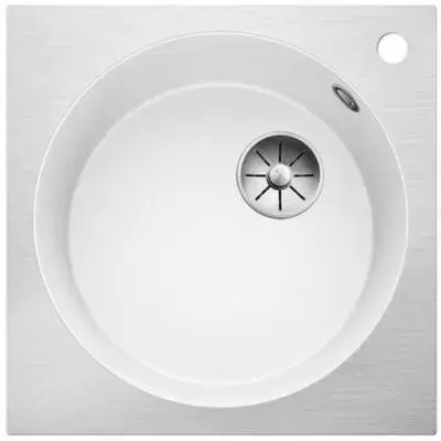 Blanco ARTAGO 6-IF/A — гранитная мойка со скрытым переливом C-overflow® и отводной арматурой InFino®. Круглая чаша модели дополнена квадратной внешней рамкой из нержавеющей стали.